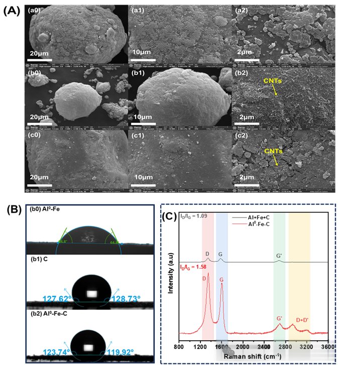 图7:(A)不同材料的扫描电子显微镜图像:(a0-a2)原始的Al0;(b0-b2)碳纳米管;(c0-c2)反应前的Al0-Fe-C;(B)不同材料的接触角;(C)通过物理混合(Al0+FeSO4+CNTs)和球磨(Al0-Fe-C)获得的材料的拉曼光谱。