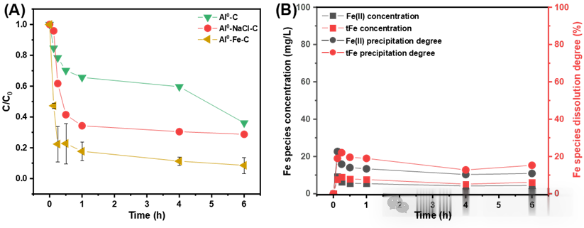图2:(A)不同助磨剂类型的降解效率;(B)在Al0-Fe-C反应过程中溶液中Fe物质的浓度和溶解度。