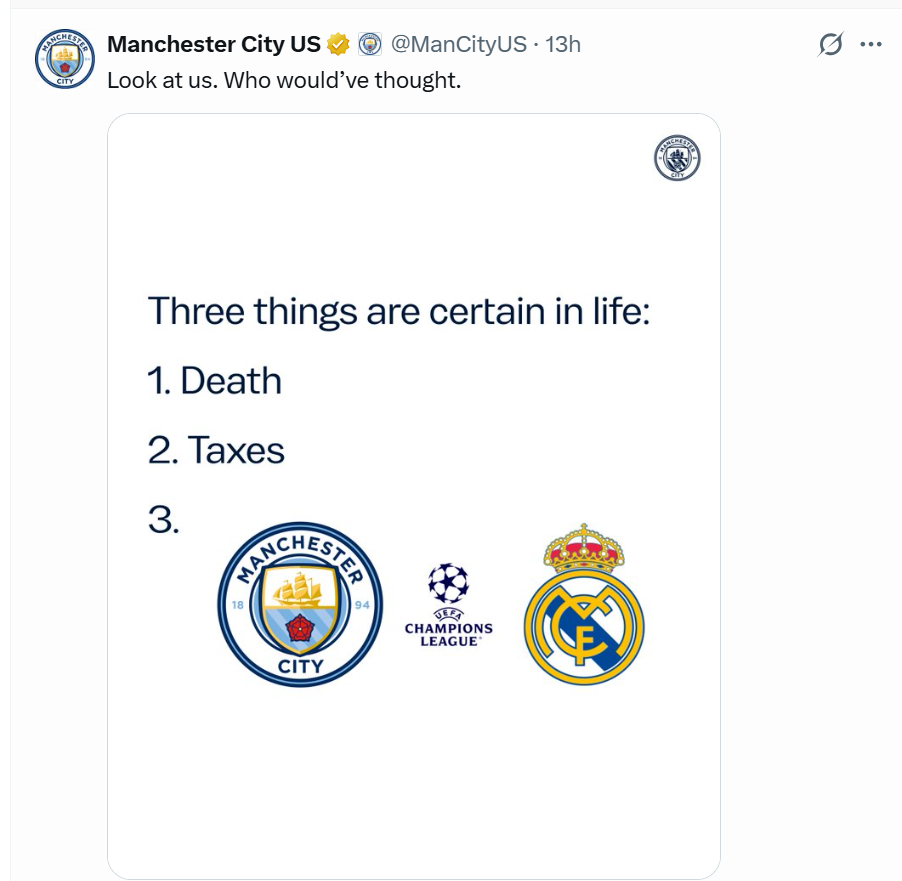 图片上写着:“人生中有三件事是注定的,1、死亡;2、税收;3、曼城vs皇马”。