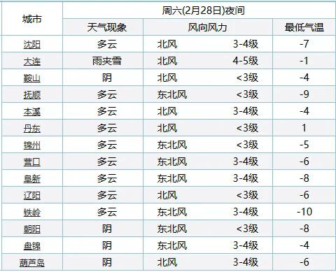 28日8时到3月1日8时,大连地区有雨夹雪或小雪,其他地区多云。