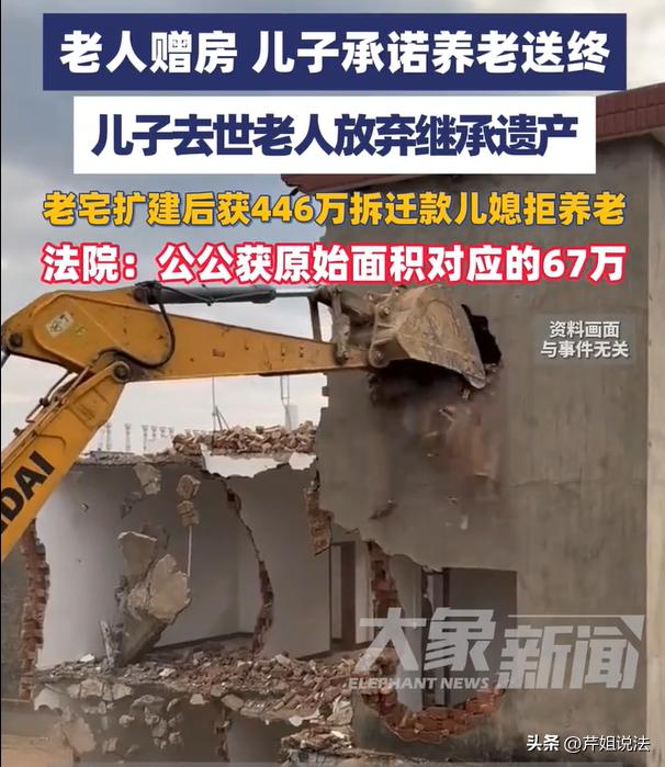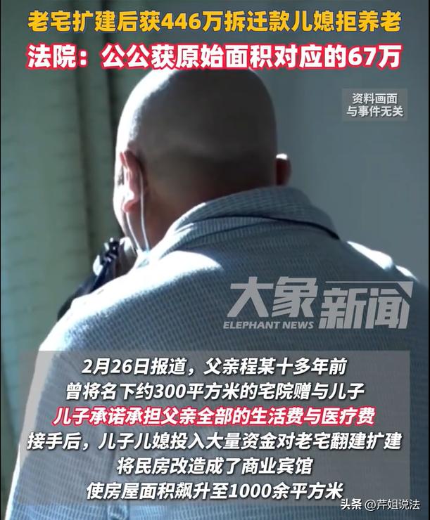 新疆,一老人老宅拆迁,就在拆迁扩建的时候,老人直接赠房,愿意将自己名下的房屋产权都给到儿子。当时儿子也承诺给父亲养老送终,谁知道儿子因为意外离世,老人家放弃继承遗产,遗产全归儿媳妇所有,之后拆迁款到了,打到了老人银行卡,老人将446万元的拆迁款立刻转给儿媳妇。没想到,儿媳眼看着钱到账了,直接断供生活费和医疗费,扬言不给老人养老。 面对如此心狠、势利的儿媳,老人家非常无奈,只能一纸诉状,将儿媳给上诉了。他想要为自己的老年生活争取一定的权益。 大象新闻2月27日报道了这则新闻。 一个老父亲程老爹,其名下有一套老宅,大概300多个平方米。 就在十年前,程老爹跟儿子说:愿意将这套宅院,无偿赠送给他。 看到父亲如此仁义,儿子也非常爽快,当时就做出了承诺:老爸,以后我一定会给你养老送终。 当老宅交到儿子手里之后,程老爹的儿子就开始正式接手,之后开始扩建,并且翻建更多的面积用来经营。 就这样,儿子跟儿媳建设出一套1000多个平方米的宾馆,用于接待外来游客使用,两个人也赚了不少辛苦钱。 可是没想到,程老爹的儿子竟然发生了意外,骤然离世,一家子都沉浸在悲痛之中。 而且在儿子去世之后,作为父亲来说,程老爹是有权利继承儿子的财产的。 但是程老爹非常仁义,直接就跟儿媳妇说,他自愿放弃,让儿媳妇全部继承。 就这样,儿媳妇赵某跟自己的儿女,均通过合理的继承权,继承了丈夫的全部遗产,包括这1000平方米的房产。 没两年,这套房子被纳入了改造项目,即将要面临拆迁。 之后,拆迁款就打到了程老爹的卡里,而程老爹也按照约定,将446万元的拆迁款,全都打给了儿媳妇赵某。 赵某在领取了补偿款之后,随即就停止对于程老爹的赡养。 不再提供生活费、也不再承担医疗费,并且直接跟老头儿说:以后我不会给你养老的! 可怜的程老爹,已经80多岁,本来还是期待老有所养,儿媳妇这一番话,让老人家陷入绝望的境地。 无奈,他为了自己的老年生活考虑,直接就一纸诉状,将儿媳妇给上诉了。 赵某拿出了证据,说自己有扩建的合同,也有付款的收据,新增的面积都是自己跟丈夫的心血。 最后,相关部门的判定下来了! 工作人员审核之后确定,老人家当初跟儿子约定了要赡养,虽然儿子离世,儿媳妇需要继续履行义务,如果停止赡养则构成违约。 另外程老爹可以获得原始房产面积对应的67万元房款,剩下的款项则归儿媳妇所有。 本案释法: 老人家赠送房产,跟儿子儿媳签订了赠送协议,约定了之后要赡养自己的晚年。后来儿子离世了,儿媳想要放弃赡养,儿媳的行为是否构成违约呢? 根据《民典法》第六百六十一条规定,赠予可以附义务,赠予附义务的,受赠人应当按照约定履行义务。 如果老人家在赠送房产的时候,有过协议约定,赡养老人需要作为受赠条件,当时儿子儿媳都确定签字的,那么这个赡养协议就会具备法律约束力。 虽然儿子离世了,但是儿媳妇需要继续履约,她也是附义务合同的当事人,如果她没有履行赡养义务,老人有权依据《民典法》第六百六十三条规定,主张撤销赠予或者追究其违约责任。 话说扩建1000个平方,而且还是改造的宾馆,这个儿媳妇在丈夫的带领下,绝对是赚了不少钱。但是到最后,还做出如此心狠的决定,此举实在令人心寒。 再回到审核案子的时候,面对老人的上诉,儿媳妇当庭抗辩,她这下知道了,这是她跟丈夫的血汗,是辛苦经营赚出来的。 这个时候把老公拉出来,怎么就没有想到,老公是存着要照顾老父亲的职责呢?你作为儿媳,虽然没有法律义务,但是口口声声的“老公”,是否应该继承丈夫的遗志,好好孝顺老人呢。 老人家一开始义不容辞,将446万元的拆迁款打到你的账上,你倒好,钱款一到,给老人家的养老义务立刻叫停。 这样的人,真的是够狠心的,内心狠如磐石啊。不仅心狠,还无德、缺德,是否也该给自己的儿女做个好榜样呢? 对此,大家都怎么看呢,不妨一起来讨论吧!