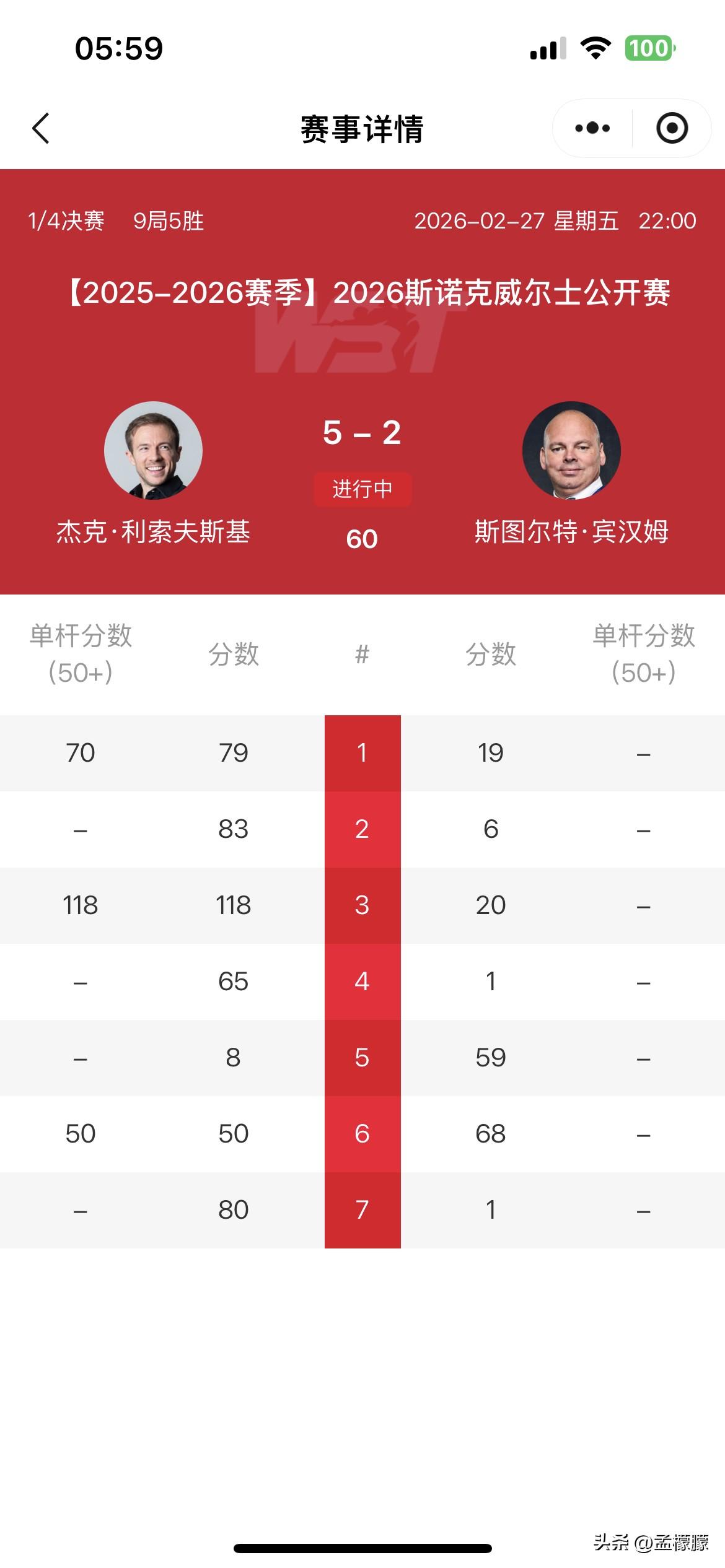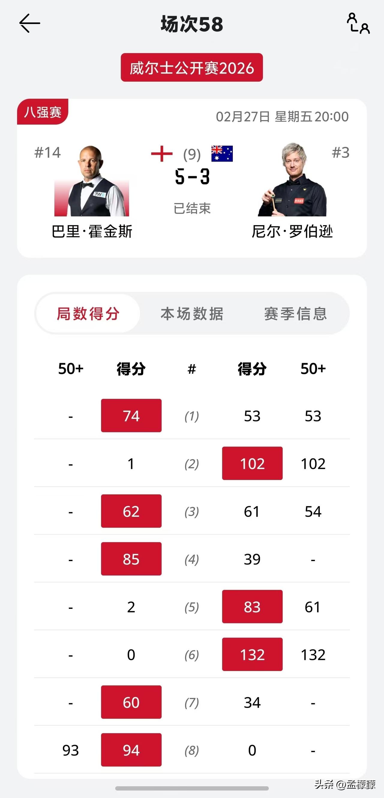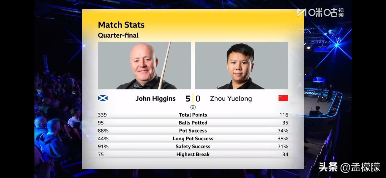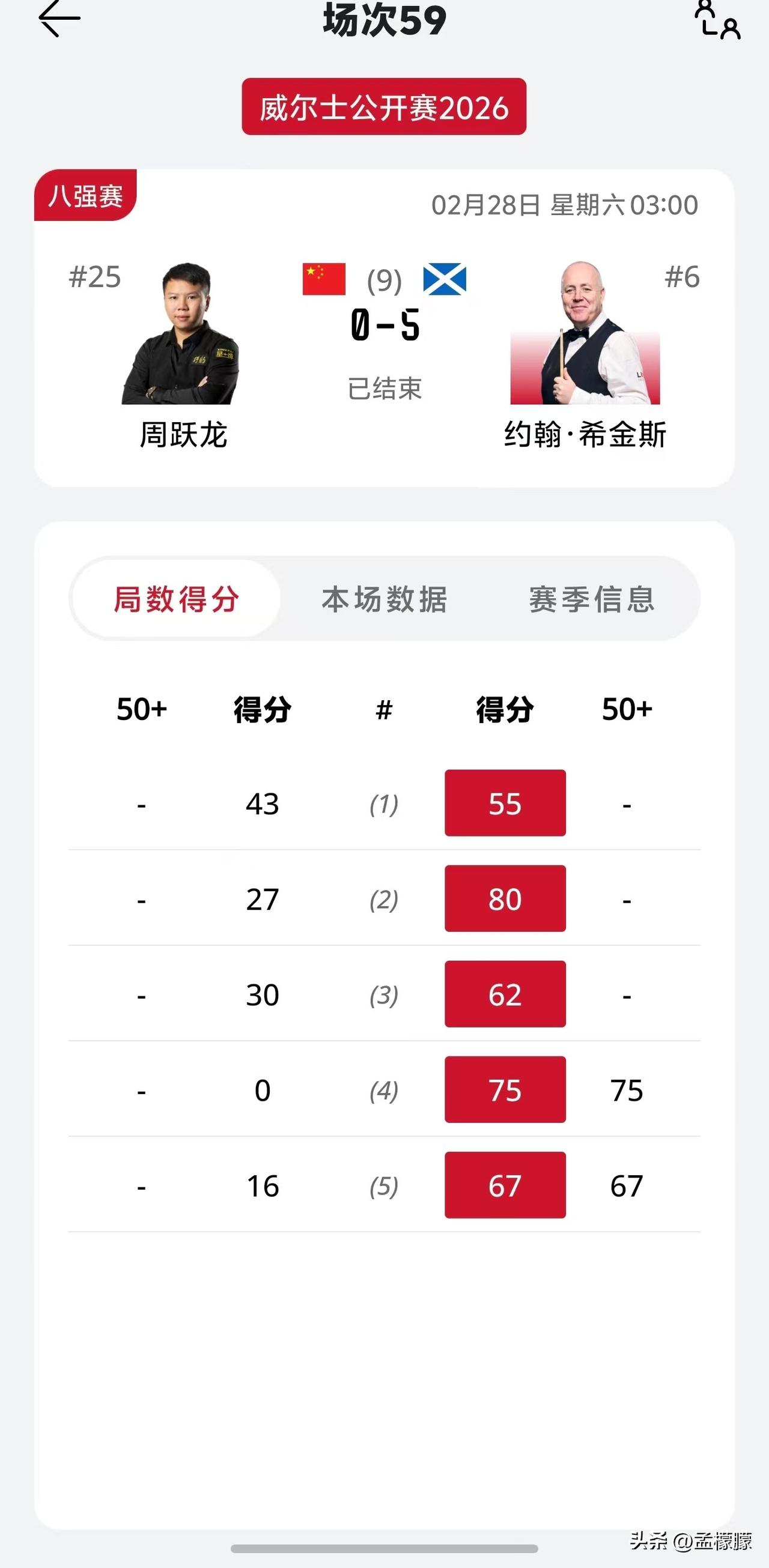 北京时间2月28日讯,2026斯诺克威尔士公开赛8进4轮次的比赛,周跃龙VS希金斯,周跃龙状态全无,0-5惨败自己的斯诺克偶像希金斯,无缘4强。也无缘本土系列赛15万英镑额外奖金了。 其他1/4决赛比赛,霍金斯5-3萝卜,小司机5-2宾汉姆。 半决赛只要小司机战胜希金斯,小司机就可获得本土系列赛15万英镑额外奖金。 吴宜泽与斯诺克黑马 江俊的1/4决赛比赛正在进行中,目前双方4-4,进入双赛点。 斯诺克 一起聊聊斯诺克 威尔士公开赛周跃龙 希金斯 斯诺克四强