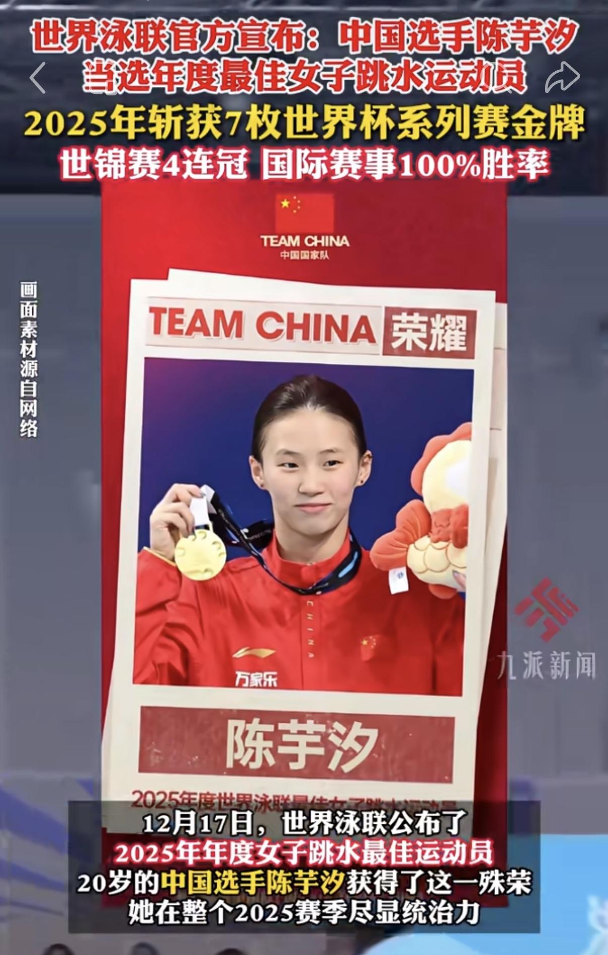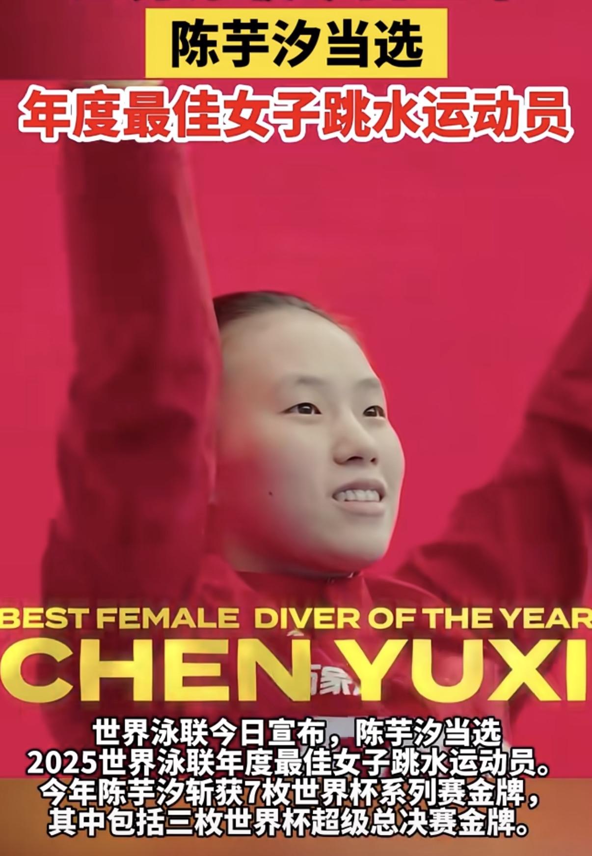 唯一上榜的中国选手! 陈芋汐,真牛! 世界泳联13项年度最佳, 她是唯一的中国名字。 当莱昂•马尔尚、麦金托什等 世界泳坛巨星悉数登榜, 陈芋汐,这个20岁的中国姑娘, 站上了女子跳水运动员的最高领奖台。 世界泳联的评语只有一句话, 却重若干钧: "陈芋汐继续在女子10米台项目树立标杆。" 什么叫标杆? 是2025年 斩获7枚世界杯系列赛金牌一一 从分站赛到超级总决赛, 金牌榜上,她的名字出现最多次。 是世锦赛女子十米台四冠王一一 一代又一代对手更迭, 她始终站在最高处,无人能够撼动。 是全年国际赛事100%胜率一一 出战即冠军,登场即巅峰。 这不是运气,是绝对的统治力。 世界泳联说: "中国跳水队的统治力尤为明显。" 而陈芋汐,就是这统治力最锋利的刀锋。 三枚世界杯超级总决赛金牌挂于胸前, 13项年度最佳运动员中唯一的中国选手, 20岁, 她已然是世界跳水女子十米台的代名词。 有人说,这是天赋。 但只有跳台知道, 那些清晨五点的入水声, 那些重复万次只为完美一翻的执着, 那些"归零再攀"的空杯心态, 才是“标杆”二字的真正注脚。 TEAM CHINA,荣耀时刻。 陈芋汐用一年七冠告诉世界: 中国跳水的辉煌,不只属于过去, 更属于此刻,属于未来。 2025已完美收官, 2026亚运会在即, 下一个辉煌,已在路上。