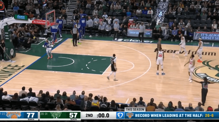 第二节比赛结束,尼克斯半场77-57领先雄鹿;