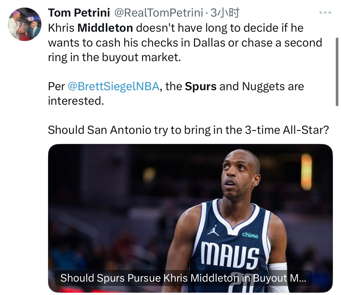 记者Brett Siegel报道:“若独行侠买断米德尔顿,掘金和马刺会对他感兴趣。”