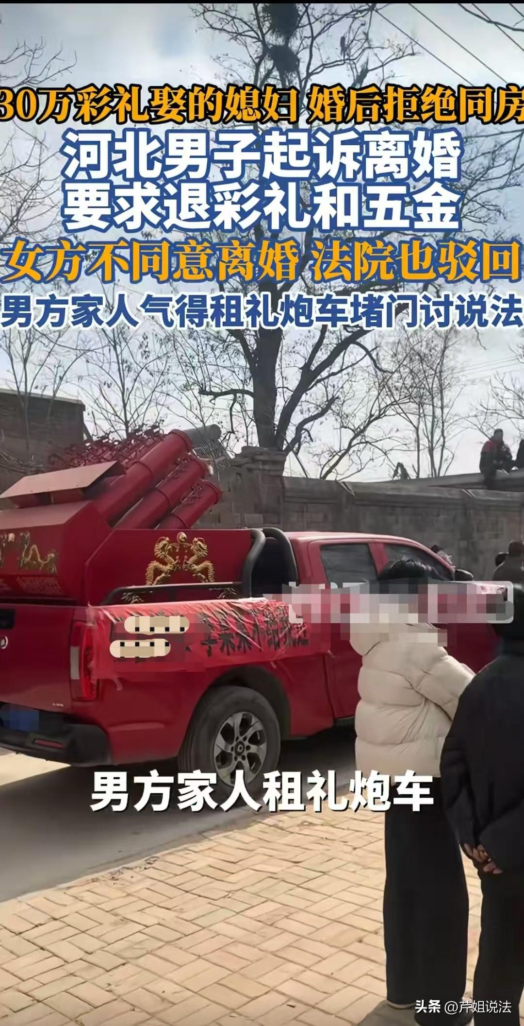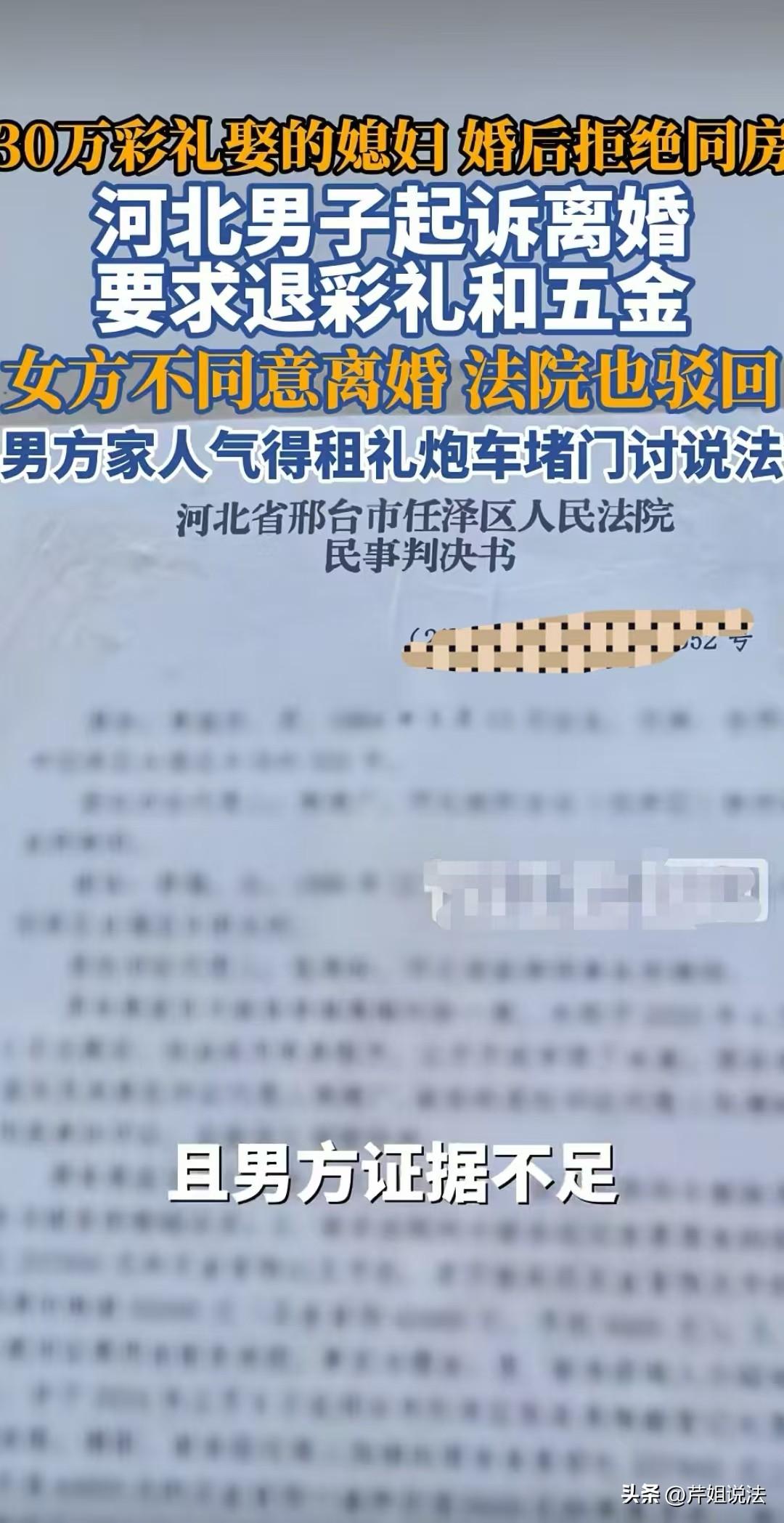 河北邢台,男子花了32万娶了个老婆,结果婚后妻子一直不让他碰,就连睡觉都要穿着睡衣不和他一个被窝,结婚10个月,两人吵了一架,妻子跑回了娘家。男子结婚后连妻子手都没摸着,心冷之下提出离婚,让妻子退回彩礼。可妻子不愿意退钱,也不愿意离婚,就愿意保持现在这样的不正常婚姻关系。男子起诉离婚,让人没想到的是,离婚竟然也离不了。 婚前,男方给女方彩礼首饰手机花费约32万,男女双方于2024年2月9登记结婚,又按照当地风俗办理了酒席,获得了双方亲友的祝福。 本来是一件很美满的一段姻缘,男方父母更是了了一件心事,眼看经过家庭共同努力,儿子的终身大事完成,日子过得更有奔头了。 可是好景不长,婚后男子总表现的闷闷不乐,父母看在眼里烦在心里,难不成小两口刚结婚就拌嘴了。 再经过了解,男子才吞吞吐吐说出女子一直拒绝同房。 父母知道这件事后虽然生气,也能体谅儿媳,是不是儿子过于粗暴,儿媳腼腆害羞,或者是例假期不方便,就劝儿子要慢慢来,不要操之过急。 以后月余,总是从小两口的房间里传出来争吵哭闹声,甚至听到儿子暴跳如雷的吼声。 天亮后,父母一询问,竟然仍没有同房。 这样的日子持续了十个月,女子干脆搬到娘家不回来了。 这下可惹火了男子一家,多次去女方家找说法,女方家长一开始也是想往好了过。毕竟男大当婚女大当嫁,嫁人了,就是别人家的人,同房理所应当。 只是女方仍不愿意回婆家,两个家庭在争吵中矛盾升级,要女方退还彩礼首饰,女方坚持不退,最终亲家成仇家。 女方一家虽然理亏,但是在争吵中也被男方激怒。不过男方一家受到的伤害更大,本来皆大欢喜的好事闹成这个局面,生气委屈不说,还让亲朋四邻看了笑话,更重要的是为了这个婚事花费30多万,到头来竹篮打水一场空。 既然通过上门讨要钱财没有结果,也懒得再见到女方一家,于是男子通过起诉离婚,并要求退还彩礼首饰。 可没想到,判决结果出来,法院以婚姻感情未破裂,各项花费证据不足,不予支持。 男方败诉后为讨要说法,宣泄心中长期积压的委屈,租了礼炮堵住女方家门口,在门外向围观群众讲述女方不履行夫妻义务,还不退还彩礼的遭遇。 目前已有相关部门介入,也了解到女方不能同房的原因,出于隐私不便泄露。 有的网友说,结婚一年多了不同房,感情还没破裂吗?关于彩礼首饰手机还有一些别的花销,一开始就奔着结婚去的,谁会想着留证据? 还有的网友会说婚内不同房又不能硬来,那就变成婚内强奸,不更冤吗? 那么男子就活该人财两空吗? 《民法典》第1079条规定,如果感情确已破裂,因感情不和分居满二年;调解无效的,应当准予离婚。 《最高法关于适用〈民法典〉婚姻家庭编的解释(一)》第五条规定,当事人请求返还按照习俗给付的彩礼的,双方办理结婚登记手续但确未共同生活,人民法院应当予以支持。 于法男方确实需要拿出足够的证据,但是,如果女方能在婚前把不能同房的原因如实告诉男方,就不会出现让人扼腕的一幕。