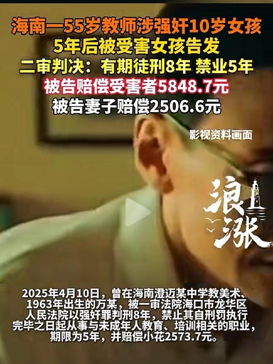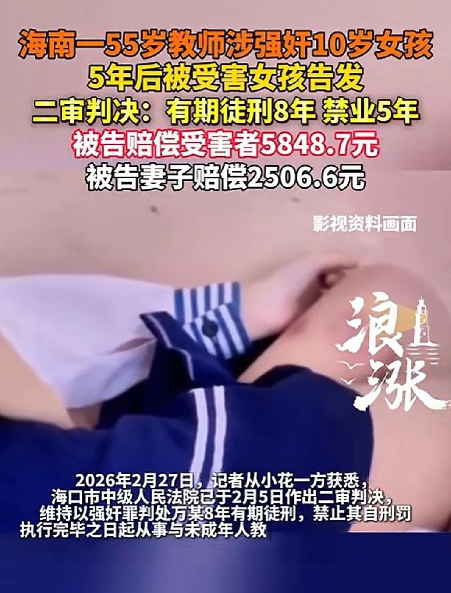 海南海口,一10岁女孩在托管中心寄宿时,遭到55岁教师的强 奸。女孩当时害怕极了,一直把这个秘密藏在心里,还因此患上抑郁症,直到5年后才告诉母亲。报案后,经过法院两审,这名教师最终被判处有期徒刑8年、禁业5年,并赔偿女孩5848.7元,托管中心负责人,也是该教师的妻子,被判赔偿2506.6元。网友直呼判的太轻了。 据浪涨新闻报道,2018年,年仅10岁的小女孩小花,因为父母工作繁忙,被送到了当地一家托管中心寄宿。 谁能料到,这段本应让孩子安心学习、生活的经历,竟成了她长达五年的噩梦。 这家托管中心的负责人,是男教师万某的妻子。时年55岁的万某,曾经是海南某中学的美术老师,平日里也会在托管中心帮忙照看孩子。 当时的小花只有10岁,年纪小、胆子也小,没想到在托管中心寄宿期间,竟然遭到了万某的性侵。 面对成年男子的侵害,小花害怕到了极点,她不知道该向谁求助,也不敢把这件事告诉任何人,只能把这个痛苦的秘密死死藏在心里。 事发当天,小花的父亲像往常一样周五开车去托管中心接她回家,一路上小花都在不停地哭,回到家后还一直说自己身体很痛。 母亲田女士发现女儿私处有破皮的情况,内裤上还沾有血迹,可她当时并没有往坏处想,只以为孩子是身体“内热”,简单给女儿涂了药膏就没再深究。 小花看着父母没有察觉,心里的恐惧和委屈更甚,可她依旧不敢说出真相,只能独自承受着这份伤害。 在那之后,小花的性格慢慢发生了变化,她变得沉默寡言、自卑敏感,夜里经常做噩梦,内心的痛苦和煎熬把小花一步步压垮。 身边的小伙伴偶尔听她提起过,小时候在托管中心被万某乱摸、被欺负的事,可年纪尚小的孩子们也不懂这意味着什么,这件事就这样被掩盖了下来。 而万某却始终若无其事,继续在托管中心活动,丝毫没有为自己的恶行感到愧疚。 时间一晃过去了五年,2023年9月,当年10岁的小花已经长成了15岁的中学生。 这五年来,性 侵带来的阴影一直笼罩着她,让她长期活在恐惧、自责和痛苦之中,最终患上了抑郁症。 再也无法承受心理折磨的小花,终于鼓起勇气,把埋藏在心底五年的秘密,一五一十地告诉了母亲田女士。 得知真相的田女士如同晴天霹雳,她又心疼又愤怒,后悔自己当年没有及时发现女儿的异常,让孩子独自承受了这么多年的痛苦。 小花的父母立刻选择报警,警方也很快将犯罪嫌疑人万某抓获。 经过医院检查,小花的处女膜确实存在陈旧性痕迹,抑郁症的诊断结果,也印证了这五年她所遭受的身心创伤。 被抓后,万某还试图狡辩,想逃脱法律的处罚,他的口供也多次反复,甚至还狡辩是小花在栽赃陷害他。 好在,法院结合证人证言以及在案证据,最终认定万某的强 奸罪成立,判处万某有期徒刑8年,并禁止其5年内从事未成年人教育和培训相关职业,同时赔偿小花经济损失2573.7元。 一审法院判决后,万某认为量刑过重,提起上诉。小花的父母也认为民事赔偿过少,同样提起了上诉。 《刑法》第二百三十六条规定:以暴力、胁迫或者其他手段强 奸妇女的,处三年以上十年以下有期徒刑。奸 淫不满十四周岁的幼女的,以强 奸论,从重处罚。 小花被侵害时仅10岁,属于刑法明确保护的“不满十四周岁幼女”,法律不问手段、不问是否“同意”,只要发生性关系,一律按强奸罪认定,且必须从重处罚。 万某在托管中心对未成年人负有临时看护职责,属于对未成年人有特殊职责的人员,利用托管寄宿的封闭环境实施侵害,依法应在从重基础上再从严裁量。 其次,“禁业5年”是基于其侵害未成年人的职业风险作出的从业禁止,属于附加惩戒,并无不妥。 最后,刑事附带民事诉讼法定只赔直接物质损失,不支持精神损害抚慰金,赔偿范围有限。 综上,二审法院经过审理,最终维持了对万某有期徒刑8年、禁业5年的刑事判决,将民事赔偿金额改判为5848.7元,同时判决托管中心负责人、也就是万某的妻子,赔偿小花2506.6元。 一个本该无忧无虑成长的女孩,因为恶魔的恶行,人生被彻底改变,而这样的判决,也让很多人难以平息心中的怒火。 不少人觉得,万某对未成年人实施性侵,性质极其恶劣,还给孩子造成了终身难忘的心理创伤,枪毙都是轻的,怎么还能允许他继续当个教师? 小花承受了五年的心里折磨,竟然只赔偿5848.7元,这样的赔偿金额少得可怜,根本无法弥补小花多年来受到的伤害。