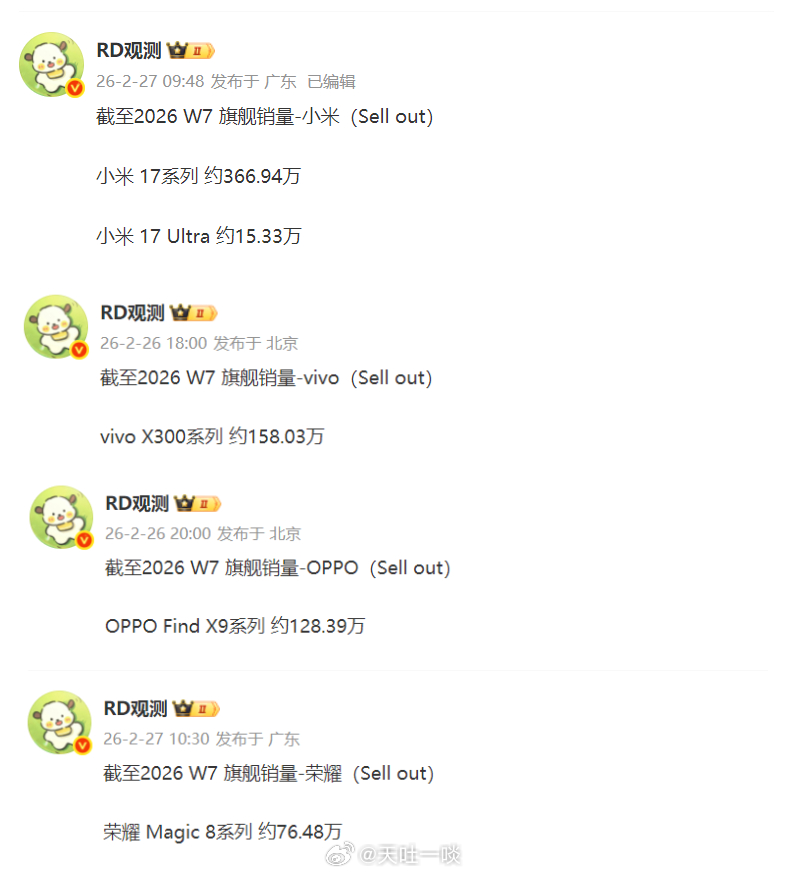 截至W7周小米、vivo、OPPO、荣耀当家旗舰最新销量1、小米17系列累计销量