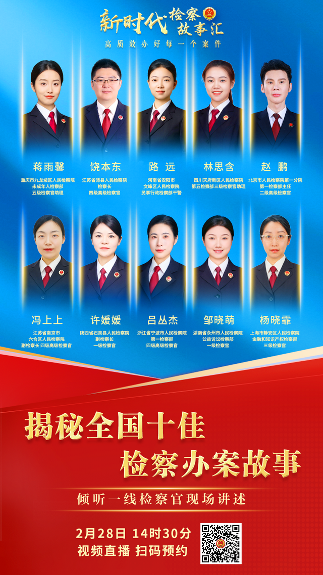 2月28日14时30分,最高检将举行“新时代检察故事汇——检察官讲述办案故事”现场汇报会,邀请一线检察官现场讲述办案故事。最高人民检察院视频号将进行直播,敬请关注!
