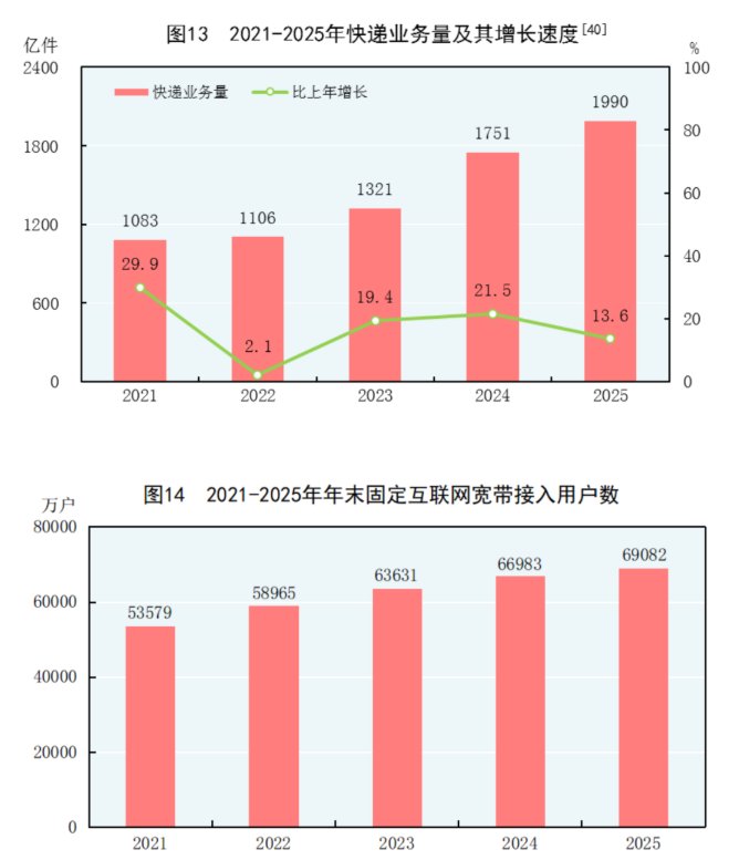 格隆汇2月28日|国家统计局今日发布的2025年国民经济和社会发展统计公报显示,全年完成邮政行业寄递业务总量2165亿件,比上年增长11.8%。邮政业完成邮政函件业务6.8亿件,包裹业务0.3亿件,快递业务量1990亿件,快递业务收入14939亿元。