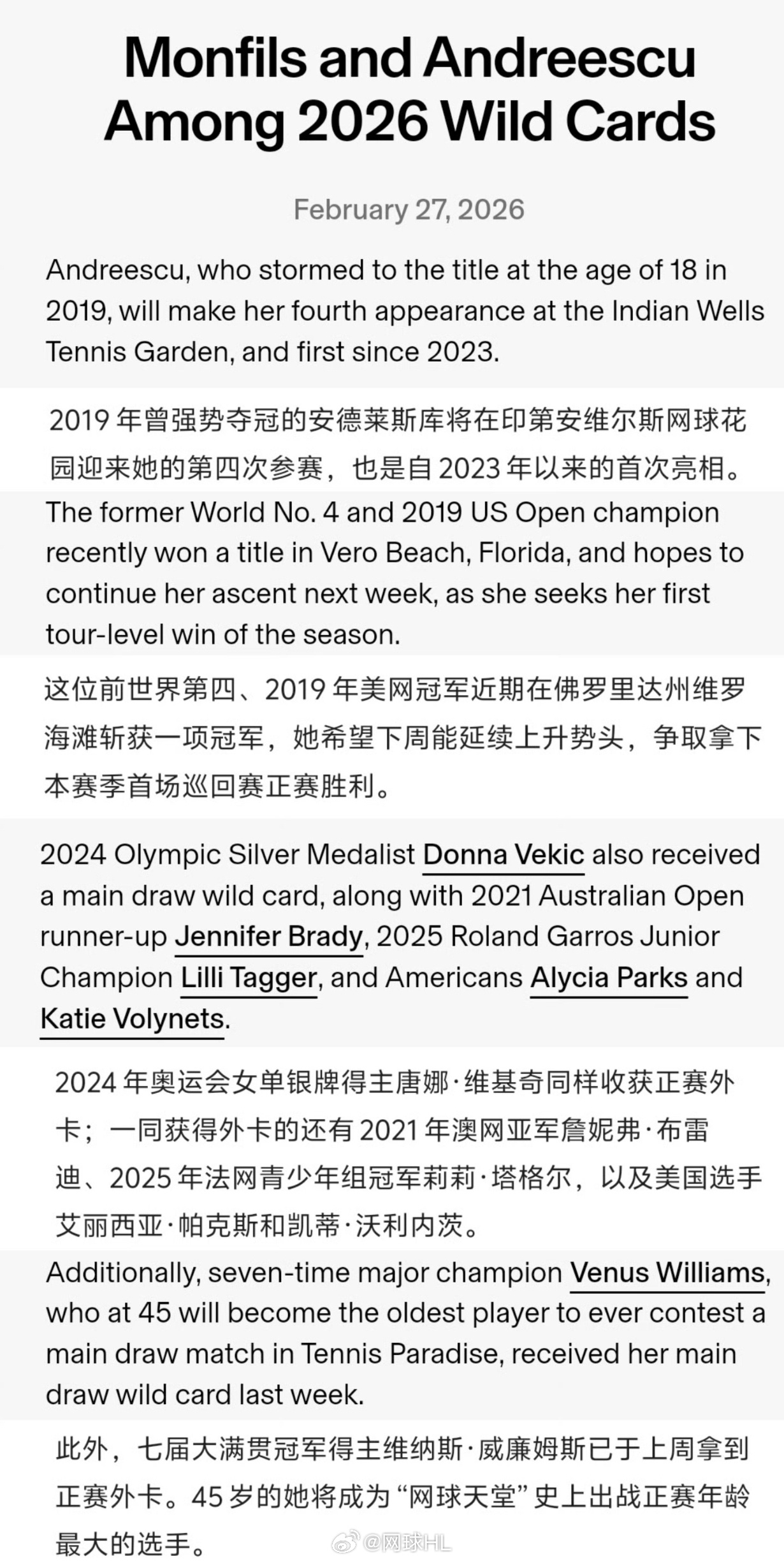 【外卡公布】印第安维尔斯女单正赛外卡👇安德烈斯库、维基奇、布雷迪、塔格尔、帕克