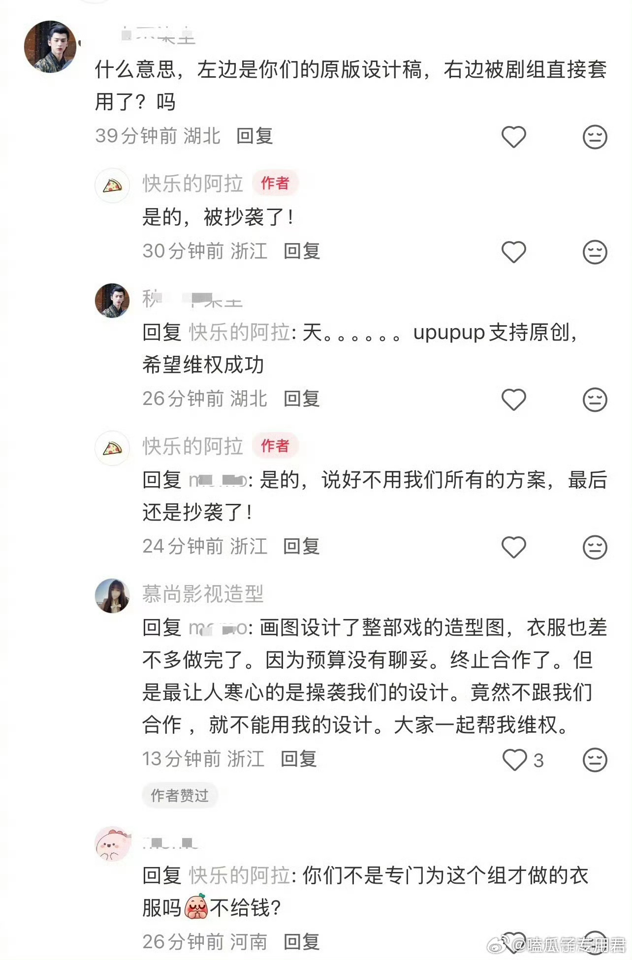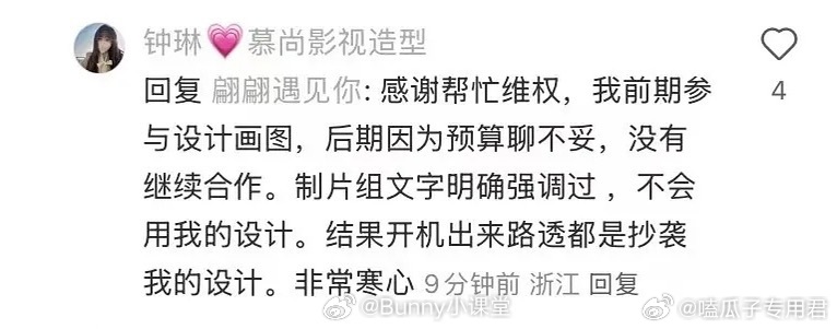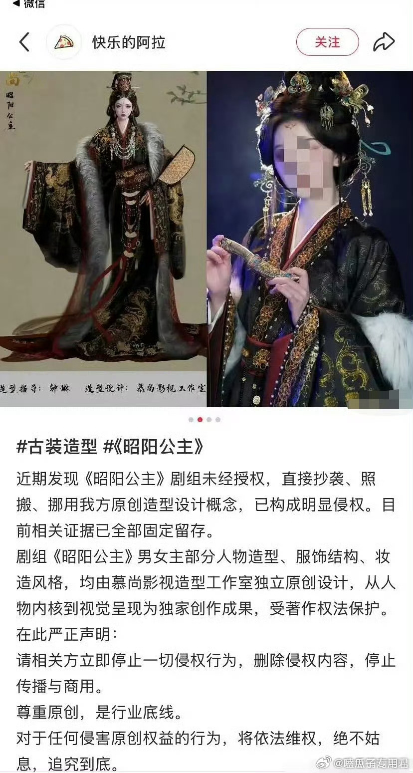 昭阳公主造型被指抄袭慕尚影视造型工作室公开声明称,《昭阳公主》剧组未经授权直接抄袭其原创设计,包括男女主人物造型、服饰结构及妆造风格等核心元素。工作室强调设计从人物内核到视觉呈现均为独家创作,受著作权法保护。