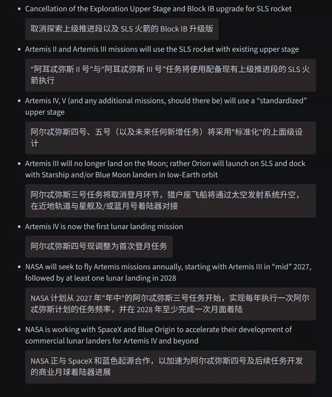 毫不意外,老美的登月计划变了,登月时间推迟一年到2028年,这已经是第二次改时间了。这么重大的项目,说改就改,跟玩似的。 阿尔忒弥斯2的载人绕月飞行直接取消,2027年执行阿尔忒弥斯3任务,也只进行近地轨道对接演示飞行任务,由sls火箭发射猎户座飞船到近地轨道,然后与SpaceX的星舰月球登陆器(或蓝色起源的蓝月号月球登陆器)对接,进行不载人飞行。一次任务,两次发射,这不是在抄袭我们吗? 而到了2028年阿尔忒弥斯4,将直接登月,而且同年还要发射阿尔忒弥斯5号,实现一年两次登月,这之前连无人绕月、无人登月都不做,就直接登月,感觉怎么又成了阿波罗一样的一锤子买卖了。 拉胯的波音、激进的空叉、磨叽的蓝源,还有瑟瑟发抖的宇航员,只能祝福老美了,能赶在中国之前登月比什么都重要。