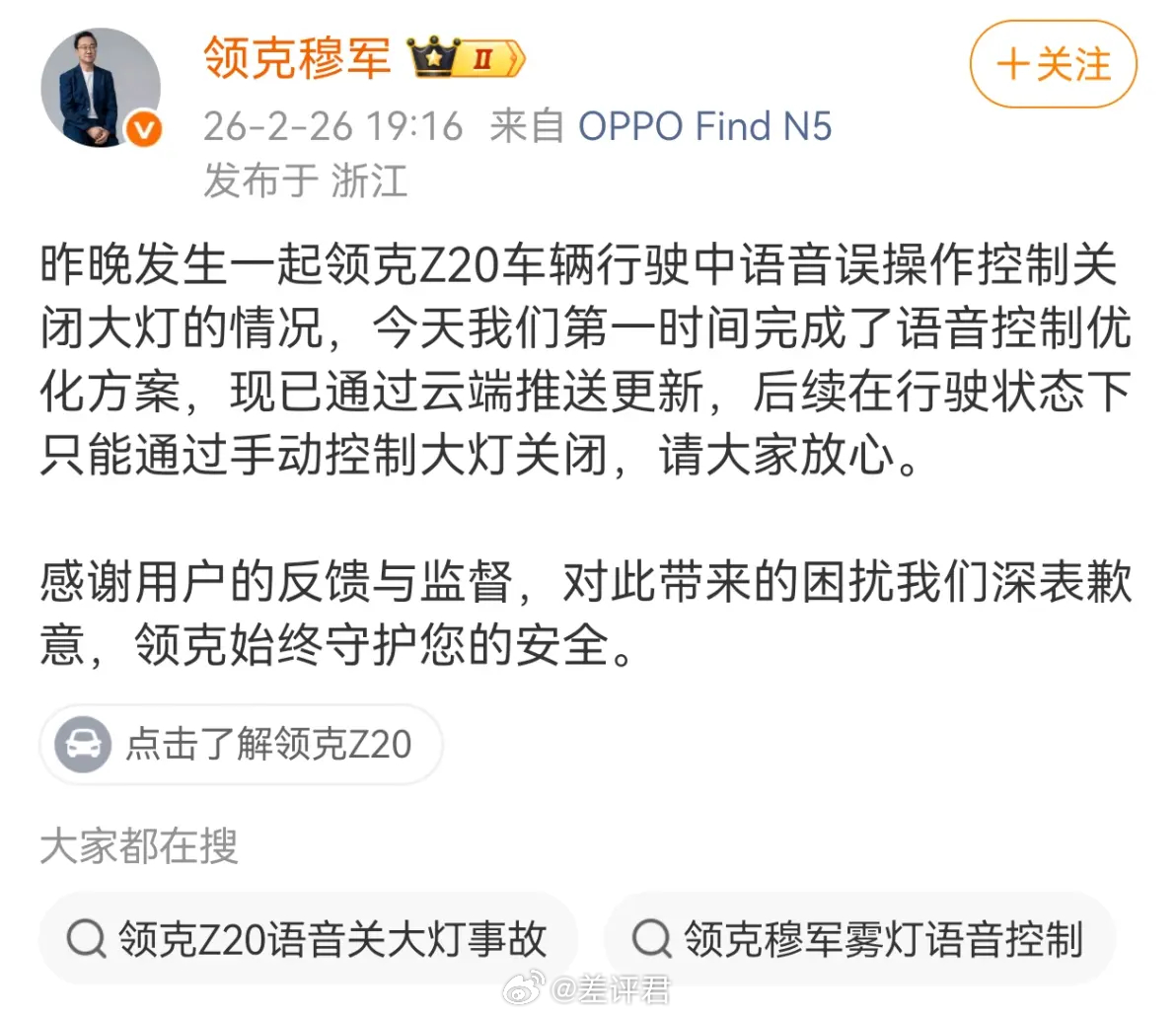 #差评说车# 领克大灯的bug已经修复了,之前正常说“关闭大灯”,会触发保护,不会关闭大灯。 但如果说“关闭所有灯”,就会把阅读灯和大灯一起关掉,好在目前已经OTA修复了。