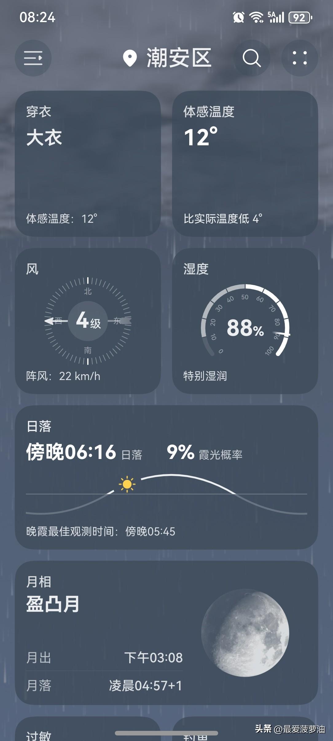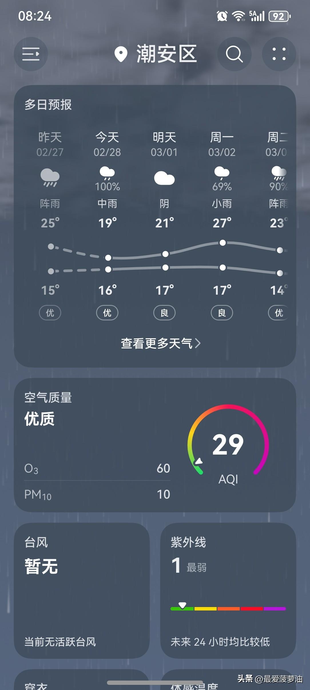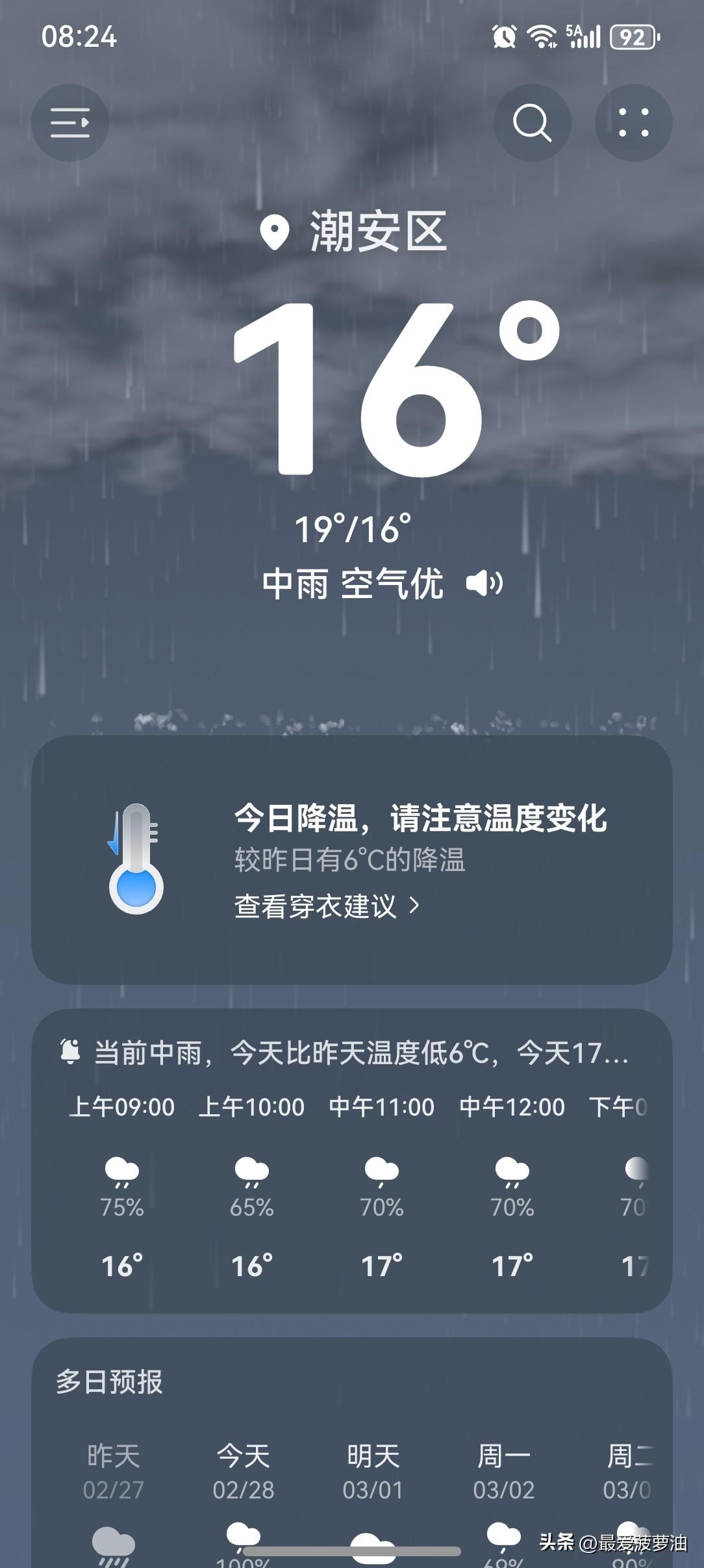 雨!雨!雨!广东马年首场强对流天气闪亮登场啦! 未来三天(2月28日~3月2日),广东中北部市县有中到大雨局部暴雨,部分市县伴有 雷电、短时强降水和6-8级短时大风。 今天(28日),潮州有中雨,气温16~19℃,此刻气温16℃,体感温度12℃。 2月份的最后一天,潮州喜提“雨水+降温”大礼包! 昨天虽然阴天有雨,但气温还是蛮高的,全天最高气温还有25℃呢! 昨天晚上开始,突如其来的大风一阵一阵地刮,气温便水灵灵地下降了。 今天早上起来发现降温明显!今天的全天最高气温仅剩19℃!这降温速度就很广东,主打的就是一个:快! 一起来看看今天的天空吧!依然是阴天状态,而且有下着小雨呢!天气阴沉,大风一吹,体感更凉了几分。 今天的天气该怎么说呢?总不能算好评吧?但差评也算不上!虽然下雨,但雨势不大;虽然降温,但也不算冷! 如此天气!元芳,你怎么看? [我想静静][大笑][捂脸][笑哭][我想静静][大笑][捂脸][笑哭]