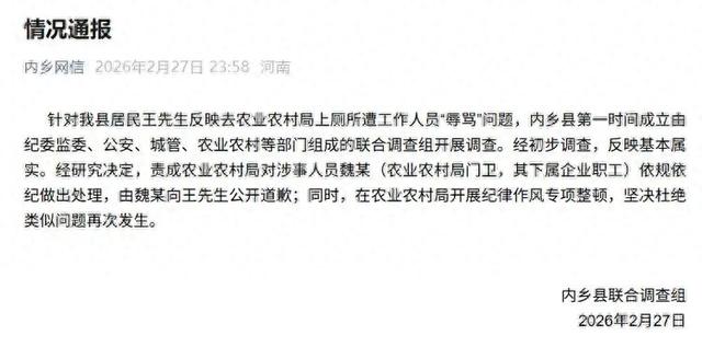 针对我县居民王先生反映去农业农村局上厕所遭工作人员“辱骂”问题,内乡县第一时间成立由纪委监委、公安、城管、农业农村等部门组成的联合调查组开展调查。经初步调查,反映基本属实。经研究决定,责成农业农村局对涉事人员魏某(农业农村局门卫,其下属企业职工)依规依纪做出处理,由魏某向王先生公开道歉;同时,在农业农村局开展纪律作风专项整顿,坚决杜绝类似问题再次发生。
