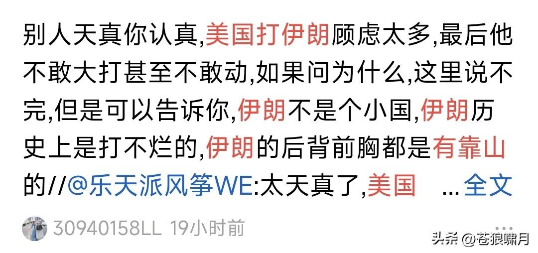 美国敢否打伊朗?这个话题最近很火!不少专家教授发文,说美帝只是威胁,不敢真动武,因伊朗国大人多,背后有两大靠山,真打恐怕下不来台! 苍狼觉得这见识,只能哈哈哈!还不如台湾名嘴老蔡,看问题深刻通透。老蔡曾放话说,伊朗若不同意美国条件,美国必打无疑,他不打才是怪事! 看到一个视频,洋记者采访老蔡:伊朗是中国朋友,你觉得中国会如何应对此事?老蔡智慧纠正洋人:伊朗人民是中国的朋友,但“神棍政权”不是! 不得不服,老蔡回答得真好!比某些专家教授强多了,高出不止多少倍! 据悉俄向伊朗派出数架大飞机,不知是否装载武器装备?回程任务是接走撤离的俄侨民,是否应对紧急情况? 目前美伊“日内瓦谈判”已破裂!美军第二支航母编队已到位,所有在中东军事基地进入临战状态,并开始撤离美在以色列工作的侨民,这是干什么? 正像蔡正元所言,老美针对的不是伊朗人民,而是“神棍政权”!目的不是占领伊朗,而是让其变成亲美政权? 至于能否实现目标?美伊冲突何时爆发?谁也无法预计,也真的管不了!就让其顺其自然,静观其变为好! …………