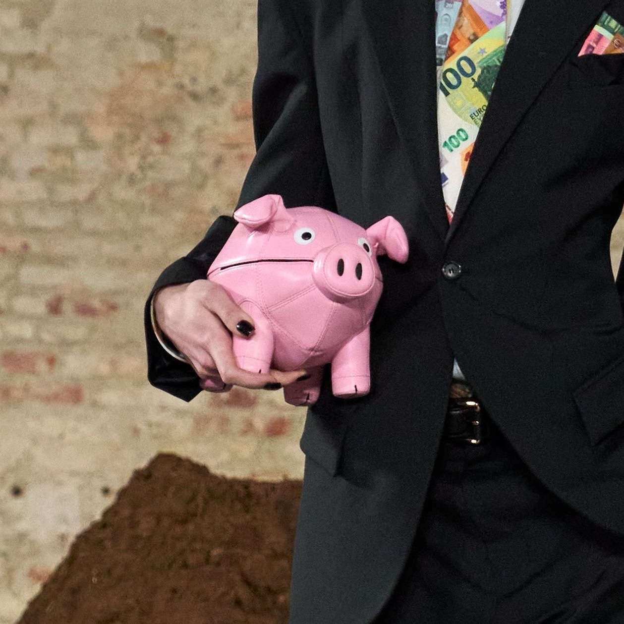高跟鞋缀满布料欧元钞票,臂弯夹着皮革小猪存钱罐——继芹菜包、意面包走红之后,Moschino 再次用幽默玩味的配饰制造话题。