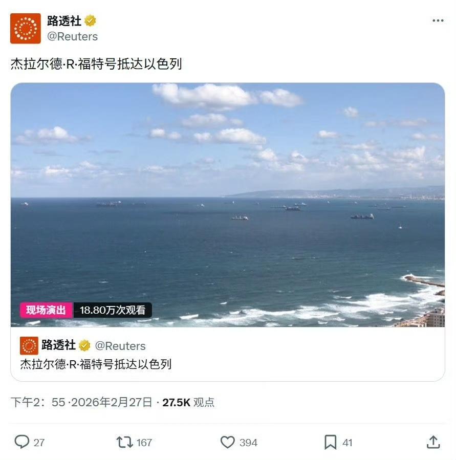 新华社也被路透社这个老六给坑了[允悲],福特号(CVN-78)还在克里特岛附近,压根儿还没去以色列。美国航母动态美国 伊朗
