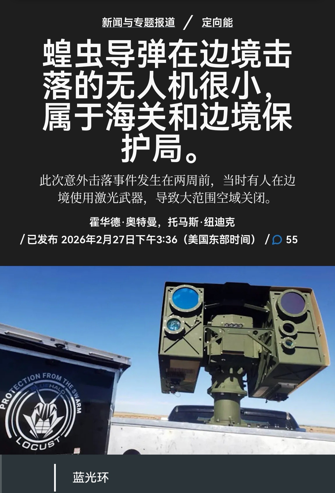 🔻TWZ报道,确认前些天美军在美墨边境击落无人机的激光武器是LOCUST“蝗虫”小型车载高能激光武器。🔻该激光武器去年才交付多部早期生产型号,开始在美军中试验装备部署,输出功率约为20千瓦,晴朗天气下可以拦截半径4-6公里内的无人机目标。