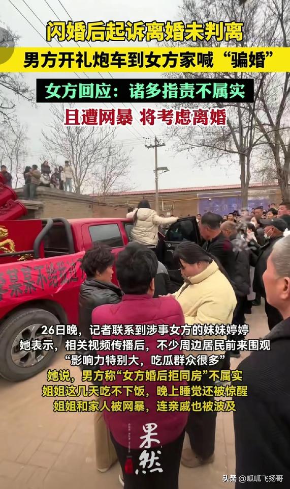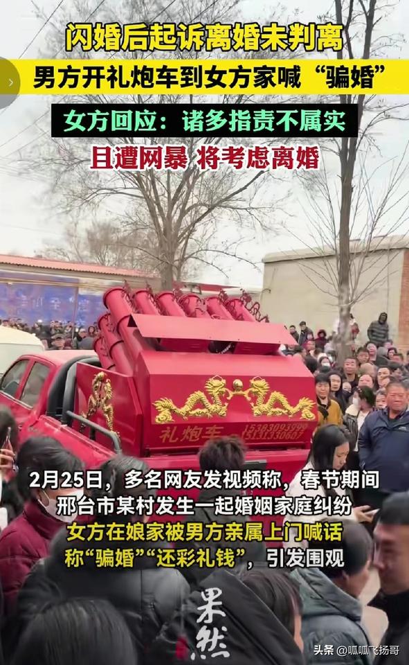早日今日,何必当初 ,女方同意离婚了! 2月25日,一辆婚庆礼炮车开到邢台任县桥头村一户农家小院前引起轰动。 礼炮车不是来接亲的,而是来找女方讨说法要离婚的。 礼炮车车身贴有一张红纸,上书黑色大字:任县桥头村,李某某不跟我过了 。 开礼炮车是男方大堂姐,她站在车上,扯起大噪门高喊:“结婚十来个月垃圾桶还带大红花,女方的衣裳一共两件,晚上睡觉不脱衣裳,内衣都不带换的” 。 大堂姐这几声高喊 ,瞬间引来一大群吃瓜群众围观。 接着村民们明白了事件缘由,男方比女方大5岁, 经媒人介绍双方接触三个月以后,于2024年2月结婚 。 但结婚以后, 双方很快就有了矛盾,女方一直拒绝与男方同房,甚至晚上连衣服都不会脱, 稍微不如意就跑回娘家。 对此男方很不满意, 向女方提出离婚,并要求女方返还彩礼257800元, 价值42800元的五金首饰,以及价值9700元的手机。 但女方却拒绝离婚 。 男方就认为女方坚持不离婚的原因就是不想还彩礼干耗男方。 于是男方向法院提起离婚诉讼,但是法院认为双方感情并没有完全破裂没有支持男方的离婚诉求。 男方大堂姐于是开着礼跑车到女方家门口向女方喊话讨说法 。 对此女方却有另外一种说法, 女方说男方的说辞不属实,男方对自己肆意打骂,还强迫自己, 害得自己患上了抑郁症到当地医院进行治疗。关于彩礼,在结婚时曾经购买家庭用品,电动车到男方家中, 加上生活开支和看病,上述彩礼已经花了,根本不存在彩礼问题 。 2月26日 ,记者联系联系到女方的妹妹,对方说相关视频传播后引来不少周边居民前来围观,她家的压力非常大, 连亲戚都受到了骚扰影响 , 现在已经考虑离婚。 (信息来源, 齐鲁晚报.果然视频) 婚姻不是儿戏,既然过不到一块 那就好和好散。 这起婚姻闹剧,我看主要原因还是双方仅接触了三个月,双方根本没有进行充分的了解, 在完全没有感情基础的情况下就匆忙闪婚,为结婚以后产生的矛盾埋下了伏笔 。 一个为结婚,一个为收彩礼,不出问题才怪。