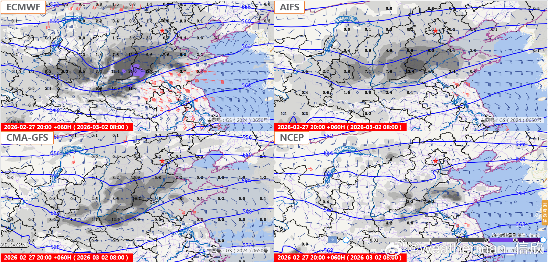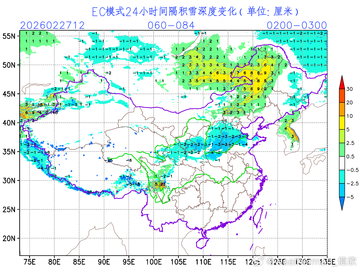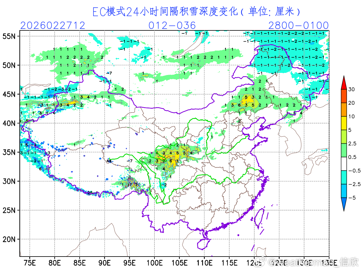 图7为数值预报给出的3月1日08时对比2月28日08时新增积雪预报,图8为3月2日08时对比3月1日08时新增积雪预报,图9为3月3日08时对比3月2日08时新增积雪预报。由于前面分析了降雪的不确定性,甘肃陕西山西河南河北一带的新增积雪预报,有较大变数。