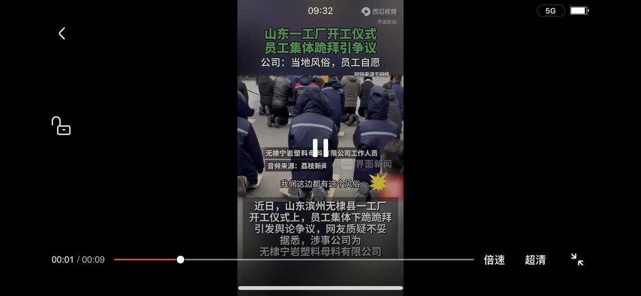 近日,山东滨州无棣县一工厂开工仪式上,员工集体下跪跪拜,引发舆论关注与争议,网友质疑不妥。2月26日,该公司工作人员回应称,这是当地的风俗,敬天敬地,员工是自愿跪的,没有强迫。 有网友表示:山东。有可能。他们拜年都是跪拜。这个不评价。静待后续。就像很多人喷年夜饭的饺子一样。先看看再说吧。 教育就是一棵树摇动另一棵树,一朵云推动另一朵云,一个灵魂唤醒另一个灵魂。教育就是父母用自己的言传身教、以身作则去唤醒一颗幼小的种子,用自己的真实行动来慢慢影响它,让它生根发芽、枝繁叶茂。真正的教育不是什么都管,也不是什么都不管,在管与不管之间还有一个词叫:唤醒。 各处乡村各处例,各地风俗不一样所以这个不评论。一些高危职业开工仪式跪拜更加无可厚非,举头三尺有神明,求平安,求健康! 这不是某个老板的问题,而是社会潜意识“文化”,就跟电视里经常播放的清宫剧一样,看多了奴性思想就根深蒂固,影响到现实社会中辐射很多问题! 说职工自愿跪拜是不可能的,普通职工只是上班拿工资而已,公司发展好坏,普通人有几个关心的,最应该跪拜的应该是老板,这跪拜肯定是强迫的。 对此大家怎么看呢