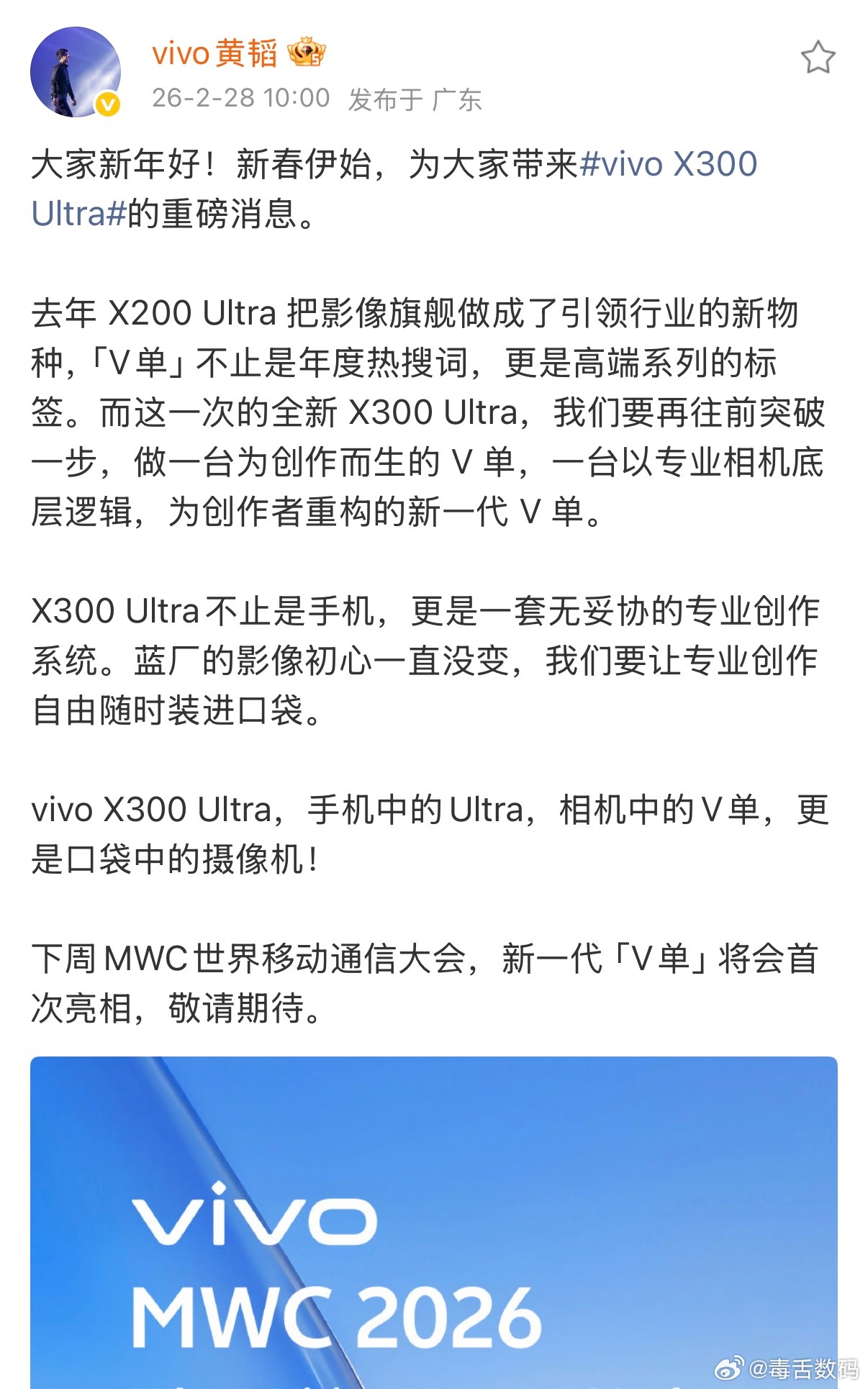 vivo X300 Ultra将亮相巴塞罗那MWC,新一代v单,国内应该也快了吧