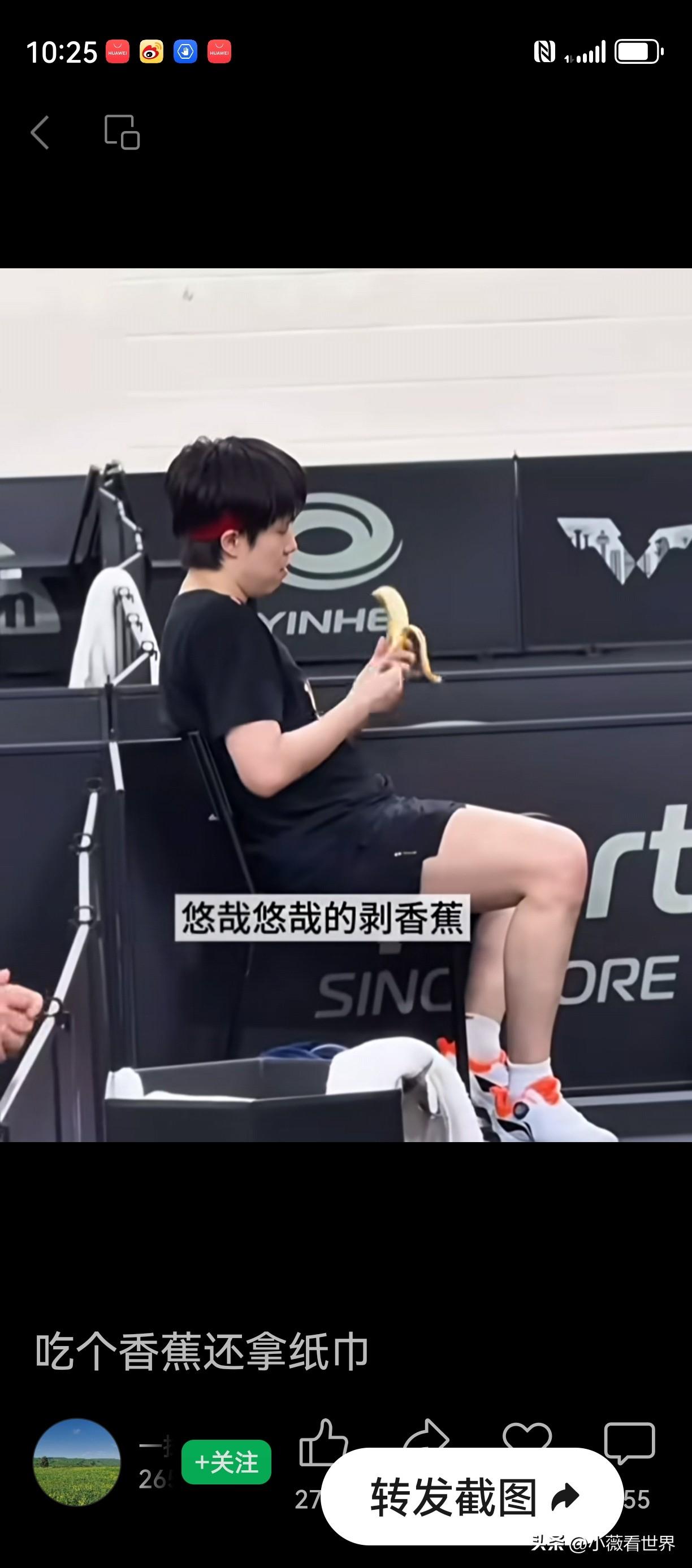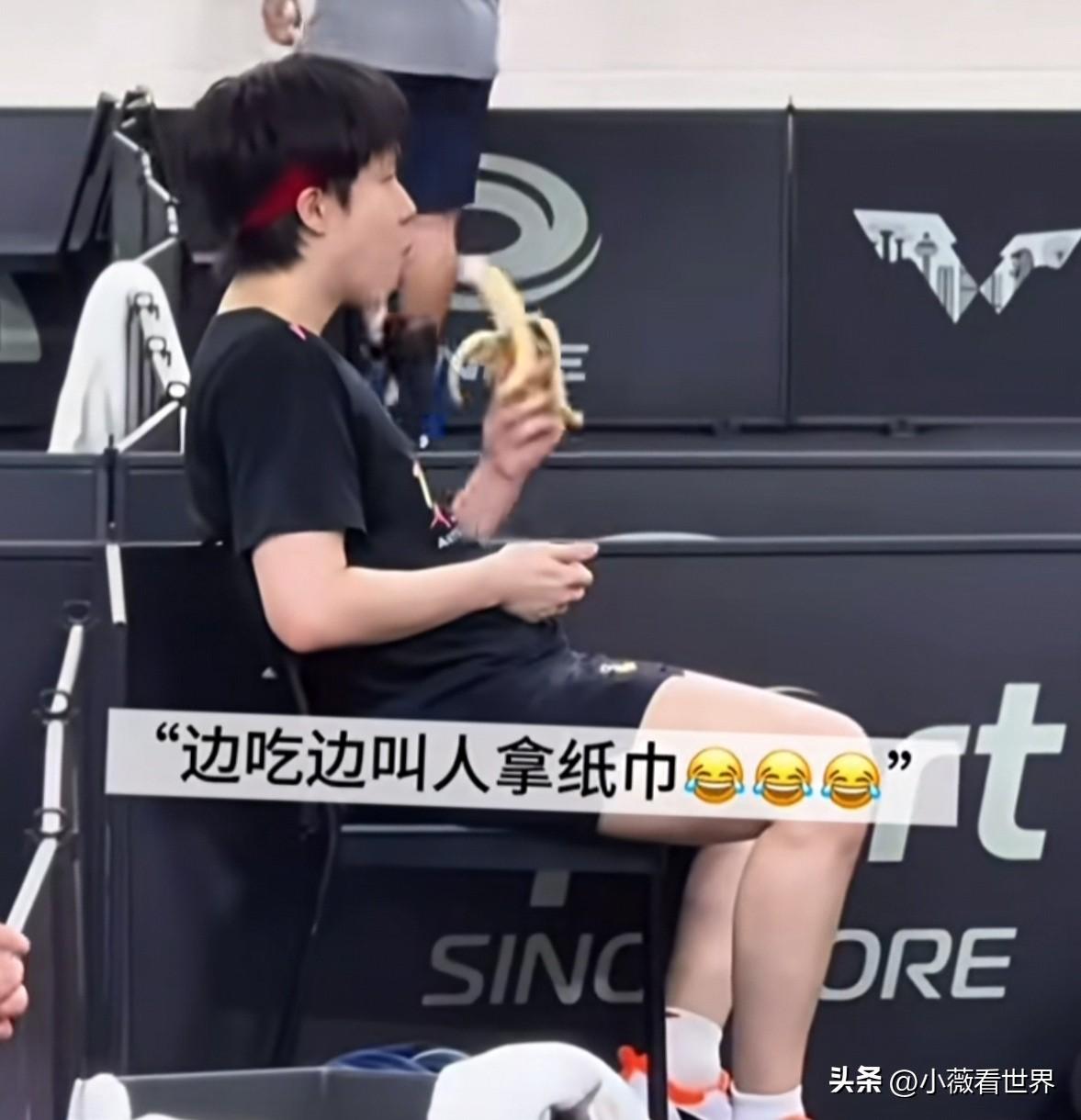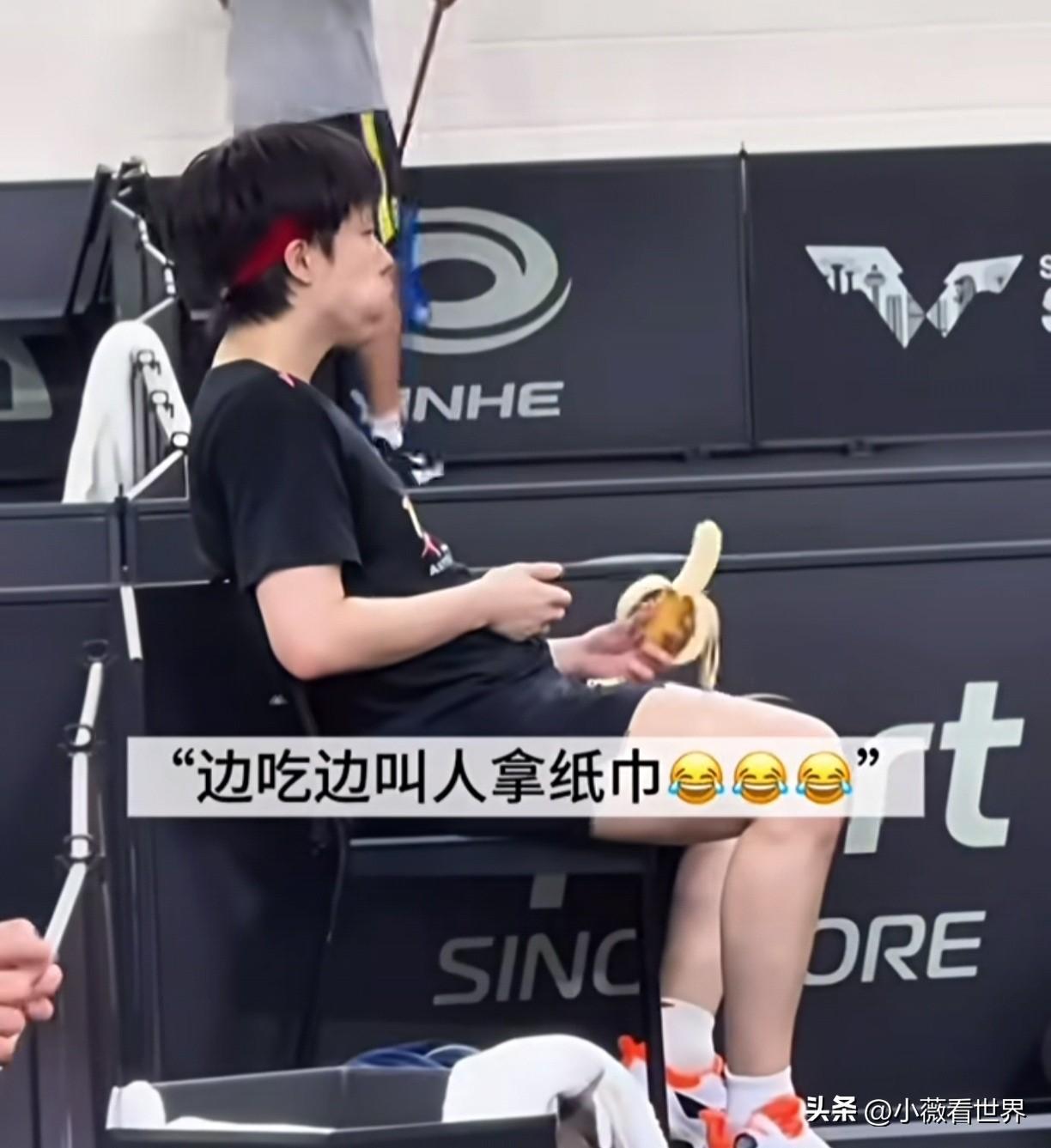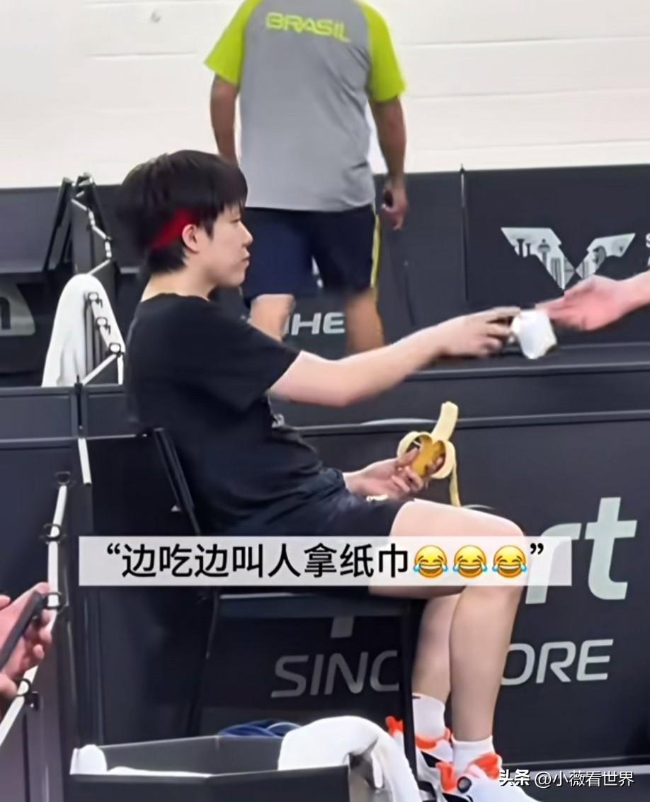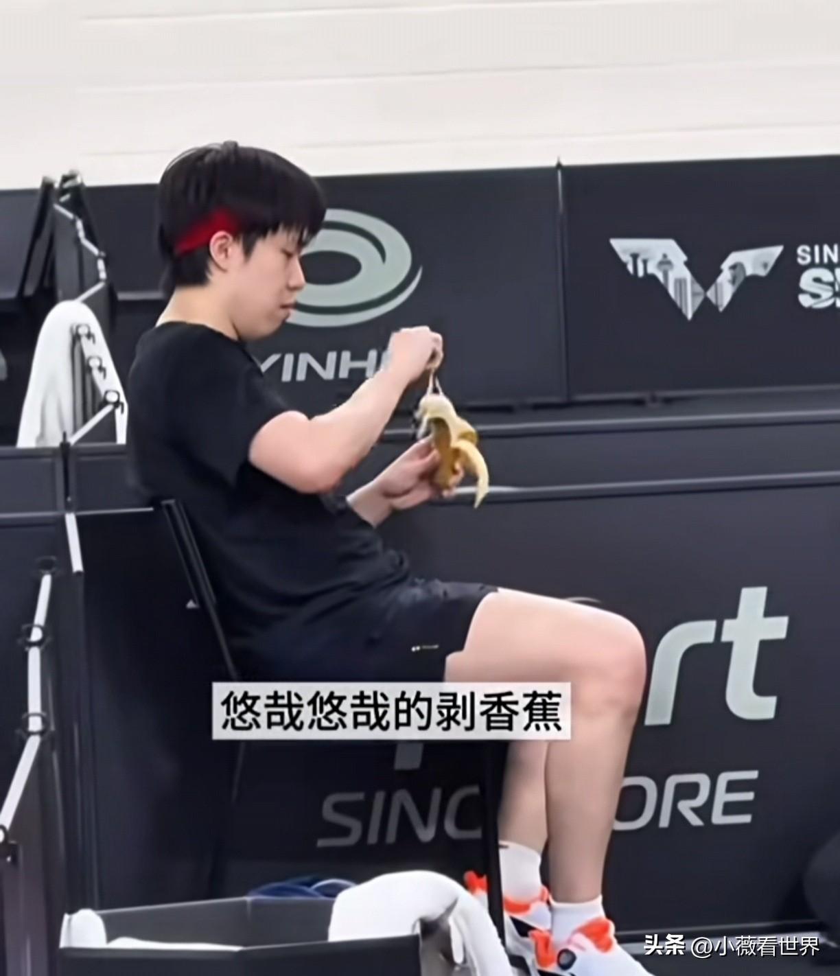 都被头哥吃香蕉的画面看笑了!这哪里还有一点赛场上叱咤风云的小狮子影子? 只见他慢悠悠开始剥香蕉皮,里面的丝也轻轻撕下来,放在裤腿上,又叫旁边人给他拿纸巾过来。 等到香蕉皮完全撕下来,且一样高低后,头哥终于开吃了,还以为他一口就吞下肚去。 谁知,剥了半天,看着要来一大口了,结果只是嘬了一顶米粒大小,关键他第一口炒了19下才全咽下去,第二口17下,真是太搞笑了。 难怪有网友开玩笑说,这香蕉不熟,放在嘴里再炒炒,纸巾备好,仪式感十足。这才是吃香蕉的最佳方式! 也有人说有这个功夫,莎莎三根香蕉🍌都吃完了,但人与人能一样吗? 哈哈!这里当然首先要恭喜头哥王楚钦3/1打败林德,至此巴黎奥运会以来所有打败他的人,都被他成功打回去了! 所以吃香蕉慢点又怎样?一到赛场上,小狮子满血复活,越战越勇,这不还把林德打哭了。 低谷期的114天,现在全部赢回来,祝福他往后都是坦途,鲜花掌声相伴! 巴黎的雨终于停了!王楚钦你最棒!继续加油咯!
