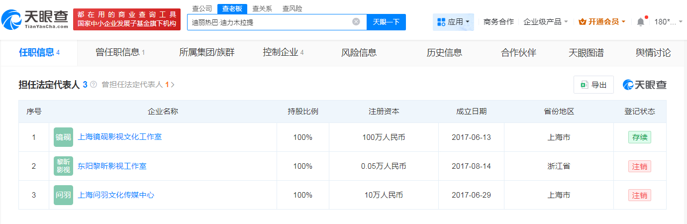 【#迪丽热巴工作室为个人独资企业#】#迪丽热巴商业版图# 2月28日,有消息称与嘉行传媒合约已到期,“迪丽热巴个人工作室”登上热搜,引发热议。天眼查信息显示,迪丽热巴名下关联企业,仅“上海镜砚影视文化工作室”为存续状态,为其个人独资企业,成立于2017年6月,出资额100万人民币,经营范围包括影视剧、舞台剧策划与咨询等。