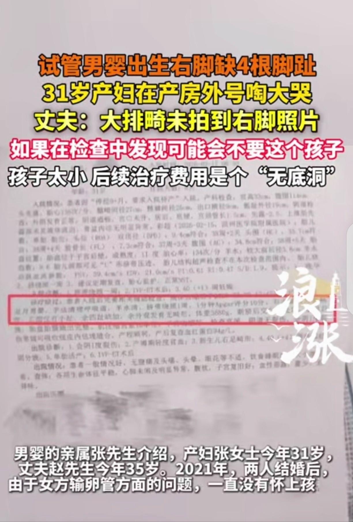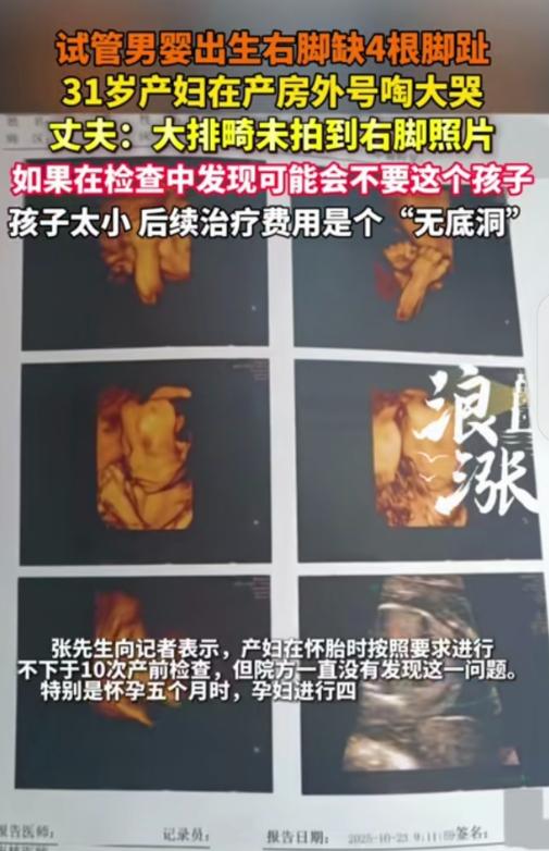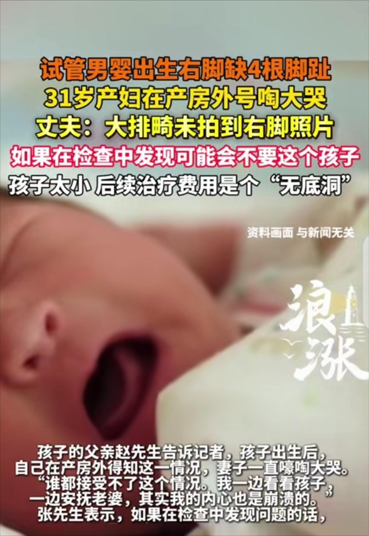 “崩溃了!”一31岁女子输卵管有问题,无法自然受孕,她和35岁丈夫去做了试管,成功怀孕后,女子做了10次产检,怀孕5个月时,又做了四维大排畸检查,胎儿一切正常,可她大年初四生下孩子,竟然发现他右脚缺4根脚趾,女子崩溃大哭。丈夫怒了:如果检查时发现,我们不会要这个孩子,后续治疗费是无底洞。 31 岁的林女士和 35 岁的丈夫结婚五年,一直没能自然受孕,去医院检查后才知道是林女士输卵管存在问题,这成了两人备孕路上的最大阻碍。 为了能拥有一个属于自己的孩子,夫妻俩商量后决定做试管婴儿,前后经历了促排、取卵、移植等一系列复杂又痛苦的流程,每一步都小心翼翼,生怕出一点差错。 好在老天眷顾,移植手术很成功,林女士顺利怀上了宝宝,这个消息让全家人都欣喜若狂,把她当成重点保护对象,处处细心照料。 自从怀孕后,林女士丝毫不敢怠慢,严格按照医生的要求按时产检,从孕 6 周的第一次 B 超确认宫内孕,到孕 11 周的 NT 检查,再到孕中期的唐氏筛查、糖耐量测试,她一次都没落下,前前后后总共做了 10 次产检。 每次拿到 “未见异常” 的检查报告,夫妻俩悬着的心就放下一分,尤其是孕 22 周那次四维大排畸检查,更是让他们彻底安了心。 检查时医生仔细查看了胎儿的心脏、脑部、脊柱等重要器官,也观察了四肢的基本形态,最后给出的报告明确写着胎儿发育正常,没有发现结构畸形,林女士还特意问了医生胎儿的手脚是否健康,得到肯定答复后,她满心都是对宝宝的期待。 整个孕期林女士忌口慎行,每天坚持补充营养,数着胎动等待宝宝的降临,家里的婴儿房也早已布置妥当,堆满了提前准备好的衣物和用品。 转眼到了过年,大年初四这天,林女士出现了临产征兆,家人赶紧把她送到医院,经过几个小时的辛苦分娩,伴随着一声响亮的啼哭,宝宝顺利降生。 可当护士把孩子抱到林女士面前,让她看看这个盼了许久的小生命时,她的笑容瞬间僵在了脸上。孩子的左脚完好无损,右脚却只有一根小趾,其余四根脚趾都不见了,光秃秃的脚掌看着格外刺眼。 林女士愣了几秒后,突然崩溃大哭,眼泪止不住地往下流,原本的喜悦被巨大的震惊和悲痛取代,身体的疲惫也被瞬间抛到脑后,只剩下满心的难以置信。 一旁的丈夫看到孩子的情况后,也瞬间怒火中烧,他拿着孕期所有的检查报告找到医院,情绪激动地表示,夫妻俩之所以坚持做完全部产检,就是为了确保孩子健康,尤其是四维大排畸,就是冲着排查畸形去的。 如果早知道孩子有这样的缺陷,他们根本不会选择生下这个孩子,毕竟后续的矫形手术不仅要让孩子遭罪, 相关的治疗费用更是个无底洞,单是简单的残端修整术都需要按趾收费,更别说后续可能需要的多次矫正和康复治疗。 医院相关负责人对此作出回应,称林女士的产检流程完全符合规范,根据现行的产科超声检查指南,四维大排畸的核心是排查胎儿心脏、脑部等重大器官的结构畸形,四肢长骨的形态会被观察,但手足趾的具体数量并不在强制筛查范围内。 胎儿在子宫内常处于蜷曲状态,加上超声设备的分辨率限制,很多细微结构难以清晰显示,这属于医学检查的客观局限,并非检查人员的疏漏。 林女士和丈夫无法接受这样的解释,他们认为既然花了钱做排畸检查,就应该得到全面的保障,现在孩子出现这样明显的畸形却没被检出,医院理应承担相应的责任。 目前双方仍在就此事协商沟通,林女士一家人也陷入了两难境地,一边是刚出生的孩子,一边是后续漫长的治疗之路和未知的费用压力,原本充满希望的新年,就这样被蒙上了一层阴影。 看着襁褓中熟睡的孩子,林女士的心情复杂到了极点,她既心疼孩子一出生就要面临身体的缺陷,又后悔当初没有得到准确的检查结果,让她失去了选择的权利。 这场满怀期待的孕育之旅,最终以这样令人心碎的方式收场,实在让人唏嘘。对此,你们有什么看法,欢迎评论留言~