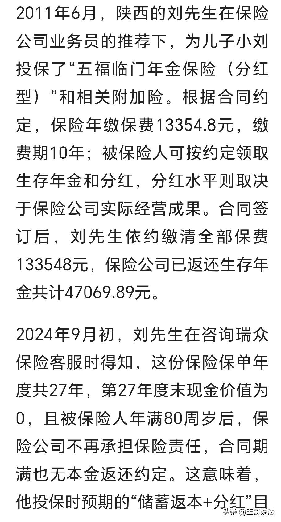 陕西,一男子给儿子买了份“储蓄返本+分红”的保险,缴费期10年,每年保费 13354.8 元,被保险人可以领取生存年金和分红,男子缴纳了10年,合计缴了 133548 元,在这期间,他领取分红47069.89,可是他突然发现,这份保险是27年,期末价值为0,而且,被保险人满80岁时,保险公司不再承担保险责任,也就是说,到期后本金取不出来,男子急了,这不是在骗人吗?他告到法院,结果令人意外。 刘先生生了个儿子,他心里高兴,为了给儿子一个保障,他决定要给儿子存一笔钱。 2011 年 6 月,刘先生在保险员的推荐下给儿子买了份保险,推销员说,这种保险,既能储蓄返本,又有分红,收益那是相当的可观。 刘先生一听,这个类型,正好符合自己的要求,他就是想给儿子存一笔钱,外加还能有些收益的打算。 他立刻签了合同,合同上约定,每年保费 13354.8 元,缴费期 10 年。 被保险人可以按照约定领取生存年金和分红,但是分红水平的多少,要看保险公司实际经营成果为准。 刘先生心想,为了儿子,这点投入不算什么,他就每年缴纳保费,按期缴纳了10 年,一共缴了 133548 元。 在这期间,保险公司也给他返还了生存年金,刘先生一共领取了 47069.89 元。 岁月如梭,日月轮换,在刘先生心里,一直以为这份保险在稳稳地增值。 一直到 2024 年 9 月,他去咨询客服,客服告诉他说,这份保险保单年度总共是 27 年,到第27 年度末,现金价值为 0。 而且,被在保险人年满 80 周岁后,保险公司就不再承担保险责任了,在合同期满,也没有返还本金的约定。 他这时才知道真相,他被骗了,这份保险压根就不给返本,也就是说,他的本钱不会给他。 也就是说,刘先生预期的“储蓄返本 + 分红”的目的根本无法实现。 刘先生急了,自己这 10 年省吃俭用,辛苦缴纳的 13 万多元保费,就是打了水漂了,这不就是在骗人吗? 他不明白,当初买的时候,业务员说得天花乱坠,明明说的是储蓄返本+分红,到了现在,怎么变成了本金取不出来? 刘先生越想越气,他一纸诉状,将保险公司告到了法院,要求解除合同,返还全部保费,还要支付资金占用利息。 法院经过调查,发现保险员在向刘先生推销保险时,明知道刘先生投保的目的是储蓄。 保险员却不告诉刘先生合同里“期满现金价值为 0、无本金返还”这些关键信息。 因此法院认为,就是因为保险公司的这种不作为行为,导致了刘先生在完全不知情的情况下做出投保决定。 最终他稀里糊涂就签了合同,使得他原本要储蓄的目的无法达成。 法院判决,解除刘先生和保险公司签的合同,要求保险公司全额返还刘先生已缴的 133548 元保费,并支付自缴费之日起的资金占用利息。 保险公司不服,提起上诉。 二审认为,合同为格式条款,保险公司作为专业机构,有责任向刘先生全面清晰的说明保险关键信息。 可是,保险公司的业务员并没有告诉刘先生,第 27 年度末现金价值为 0。 这明显是保险公司没有履行说明义务。 而且,在保险合同期满之后,刘先生可以得到的收益总额,比他已经缴纳保费还要少。 再加上到了期末,现金价值为0,不给返本,这和刘先生储蓄的预期严重不符,导致刘先生储蓄的目的无法实现。 因此,二审认为,刘先生和保险公司签的合同,完全符合解除条件。 《民法典》第566条规定: 合同解除后,尚未履行的,终止履行;已经履行的,根据履行情况和合同性质,当事人可以请求恢复原状或者采取其他补救措施,并有权请求赔偿损失。 最终,二审判决,保险公司在返还保费时,扣除已经支付的生存年金 47069.89 元,返还金额为 86478.11 元。 有人认为,买保险的前提是:要么自己能看懂保险合同条款,要么能找到靠谱的保险业务员,否则还是慎重购买。 更有人说,保险合同文本太长,一般人根本就看不懂的。 刘先生这个事情,说白了就是保险业务员抓住刘先生想给儿子存钱的需求,只谈收益,却对不反本金的关键条款绝口不提。 等刘先生发现不对劲时,10年的血汗钱眼看就要打了水漂,换做是谁都得着急。 保险合同是格式条款,保险公司有义务把话说透,不能光拣爱听的说。 毕竟大部分买保险的人都不是专业人士,要是全靠自己去啃密密麻麻的合同文本,大概率会看不明白。 这件事也提醒我们,买保险不能光听业务员的说法,不管对方说得多好多好,自己一定要看合同里的关键信息。 如果实在看不明白,那就找个懂行的人帮着看看,千万不要随意就签合同,一定要搞清楚再做决定。 对此,你怎么看?