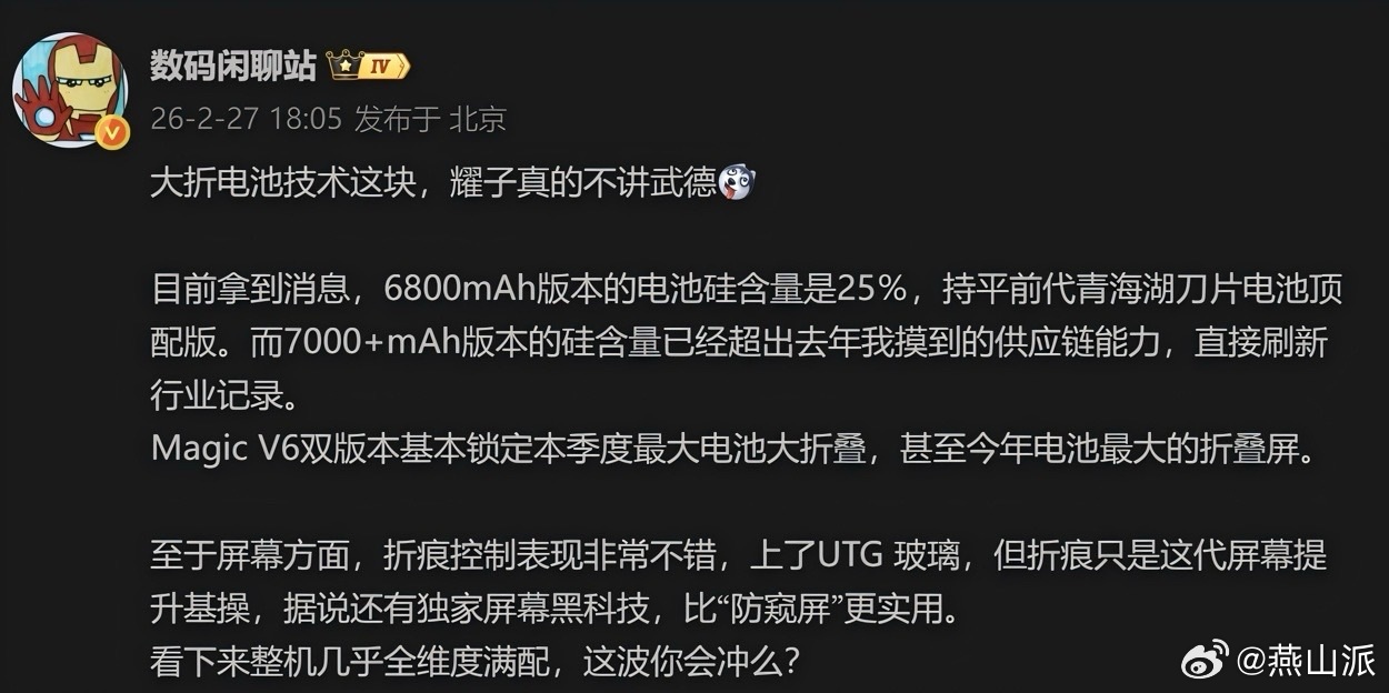 深度体验过几代荣耀折叠屏,Magic V6给我的感觉是“集大成”。电池硅含量,6800 mAh版本就达到了25%,顶配版更高。屏幕端换代了UTG玻璃,折痕控制好成为荣耀的基操了,而且还有其他黑科技,已经开卷耐用性与平整度兼顾的新方向。可以说,荣耀大折在性能、续航、轻薄、折痕表现各个维度都很顶。