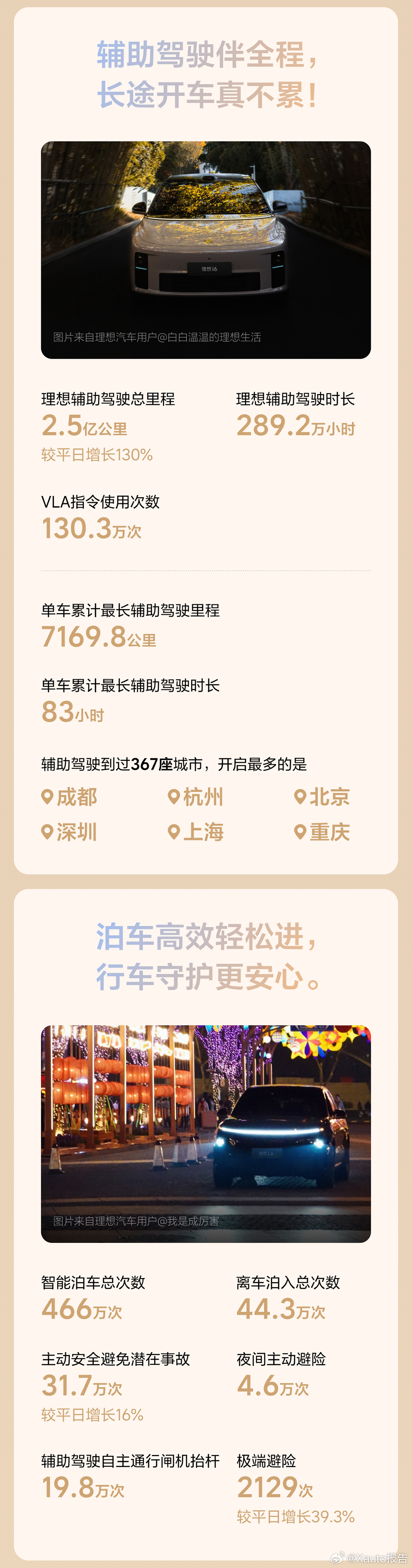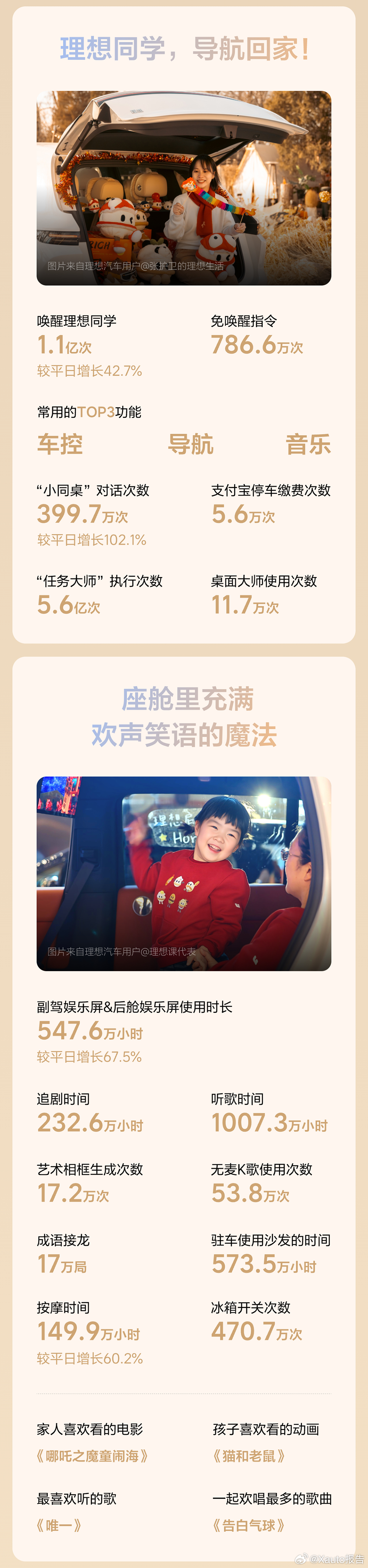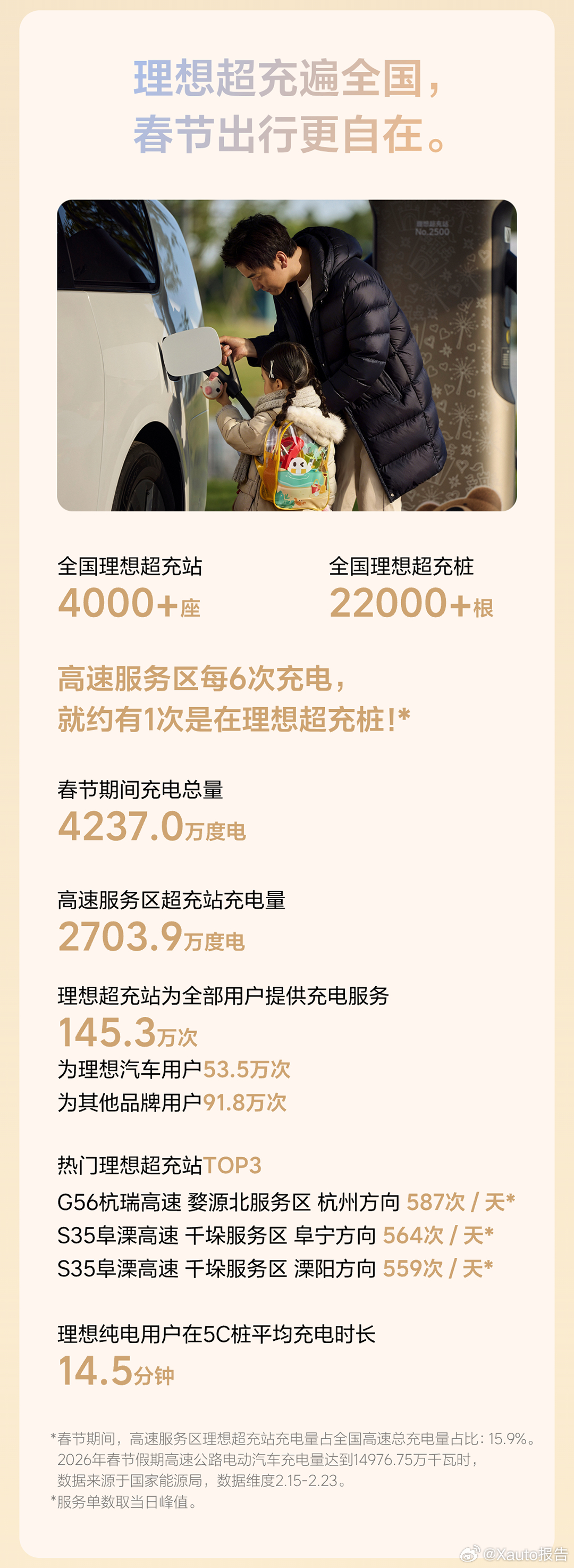 理想汽车2026春节出行报告显示,用户累计行驶11.8亿公里;辅助驾驶里程增130%,主动安全避险31.7万次;理想同学唤醒1.1亿次,超充站服务131.2万次。汽场全开理想汽车理想超充突破4000站理想l6