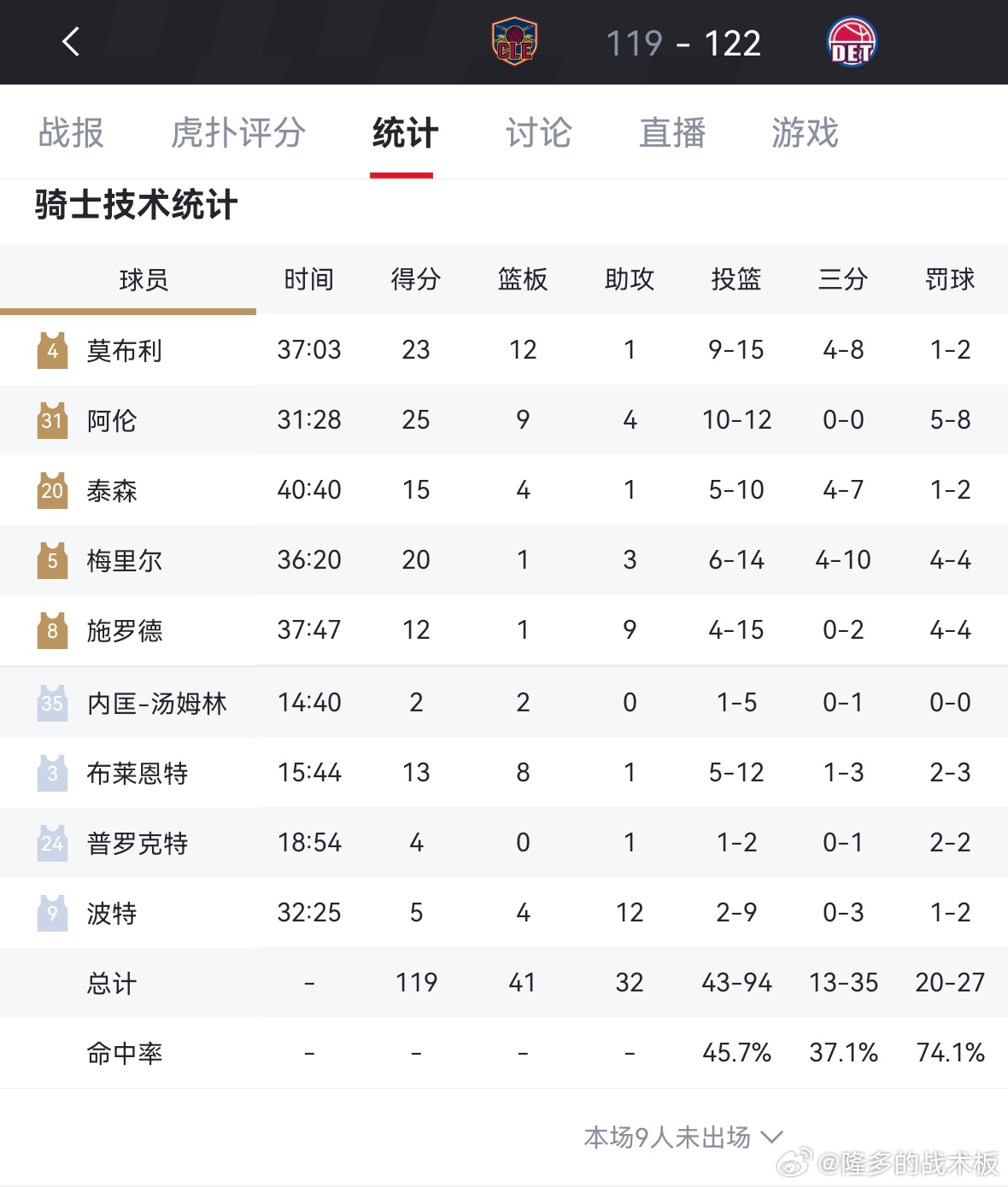 杜伦33分16板,坎宁安25分10板7助骑士vs活塞