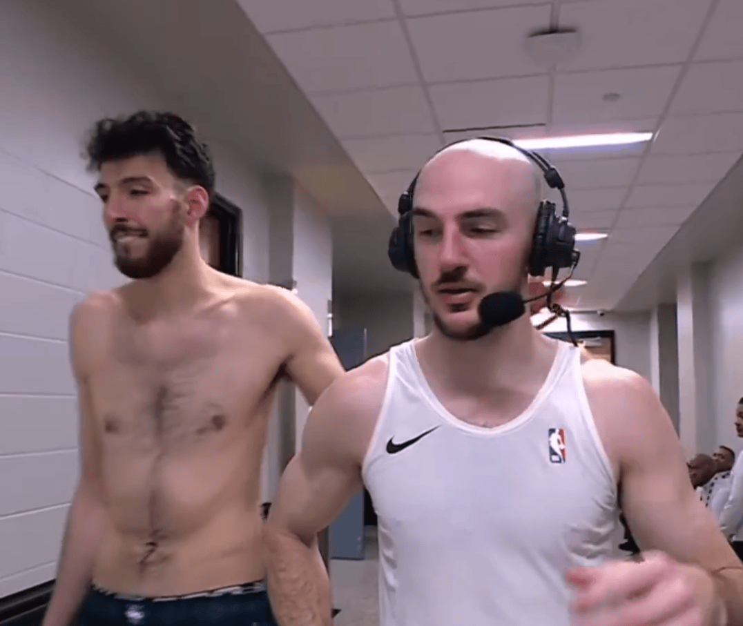 卡鲁索赛后接受巴克利连线采访时,霍姆格伦光着身子从镜头里走过;