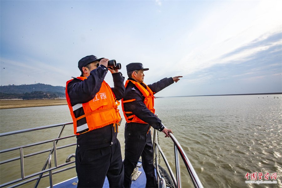 近日,江西省都昌县公安局民警在鄱阳湖水域巡查,观察候鸟情况。傅建斌摄