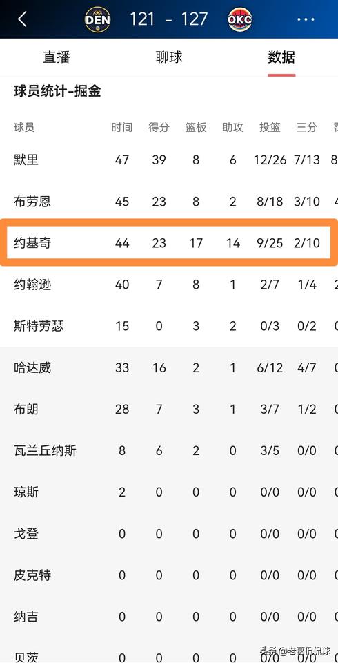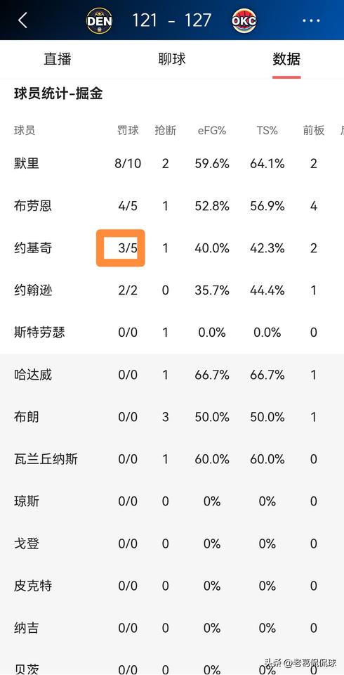 掘金巨星约基奇再次惨遭裁判的无视,他的罚球数真和亚历山大比不了!在今天掘金客场以121:127不敌雷霆的比赛中,约基奇仅仅得到了5次罚球,远远少于亚历山大的13次。 全场比赛下来,约基奇首发出战44分钟,投篮25中9,其中三分球10中2、罚球5中3空砍23分17篮板14助攻,他的场上正负值为+15。 虽然约基奇和亚历山大同为当今联盟的超级球星,但是当掘金和雷霆直接交锋的时候,亚历山大显然更受裁判的照顾,而约基奇则变成了一个惨遭裁判无视的球员。
