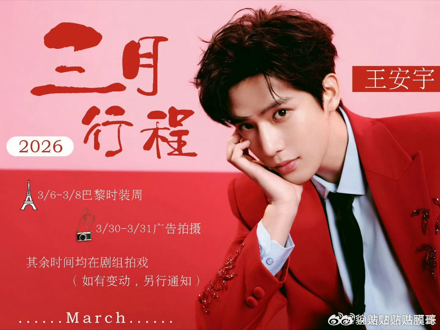 男明星三月行程图🈶李昀锐 丞磊 敖瑞鹏 王安宇 王鹤棣 许凯 胡一天 何与 曾