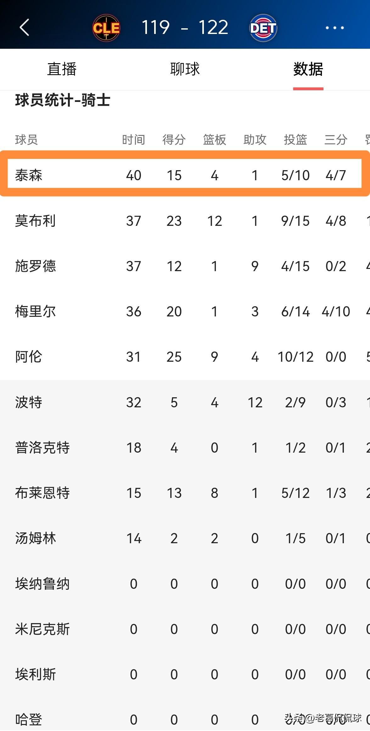 骑士小将泰森真是敢拼敢打!在今天骑士客场以119:122输给活塞的比赛中,泰森展现出了初生牛犊不怕虎的勇气,他在对位超级后卫康宁汉姆时敢拼敢打毫不畏惧。 整场比赛下来,泰森首发出战40分钟,投篮10中5,其中三分球7中4、罚球2中1非常高效的得到15分,还有4篮板2抢断。 坦白说,以泰森目前的发展势头来看,假以时日泰森一定会成长为一名非常出色的3D球员。