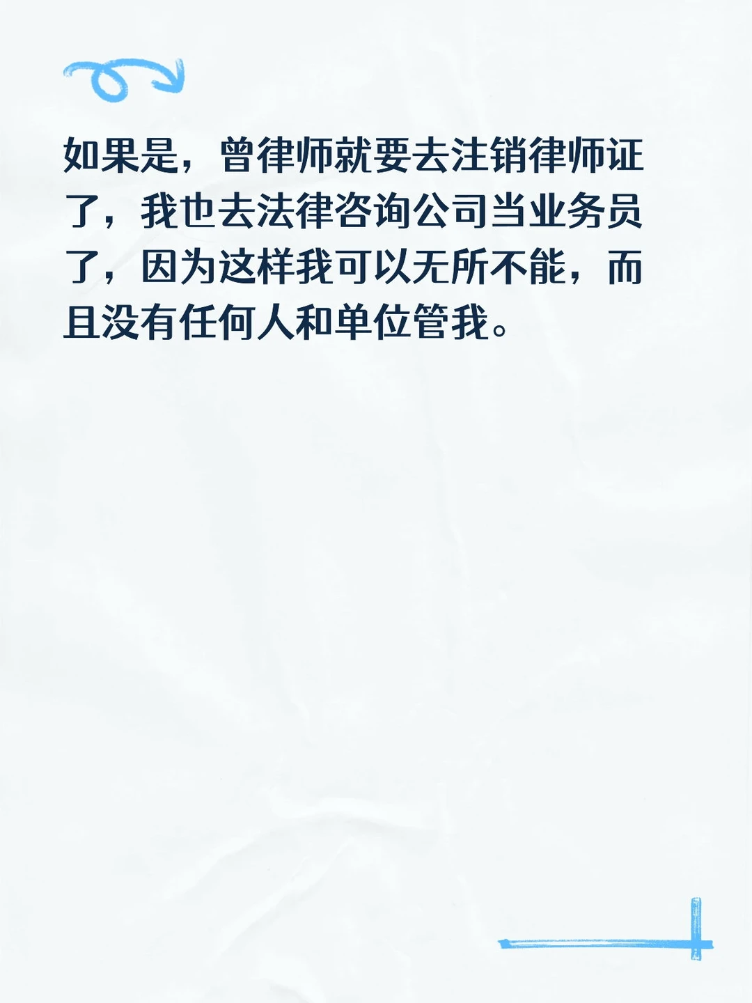 法律咨询公司比律师更好? 问大家一个问题,你们找过法律咨询公司打过官司吗?如果有,你们找法律咨询公司打官司,效果怎么样?费用是不是比律师收费更低?结果是不是更满意?它们会派人给你开庭吗? 与律师相比较,法律咨询公司提供的法律服务是不是更优质、更价廉、更亲民、更贴心、更厉害、更高效?希望大家在评论区真实回答我。 如果是,曾律师就要去注销律师证了,我也去法律咨询公司当业务员了,因为这样我可以无所不能,而且没有任何人和单位管我。