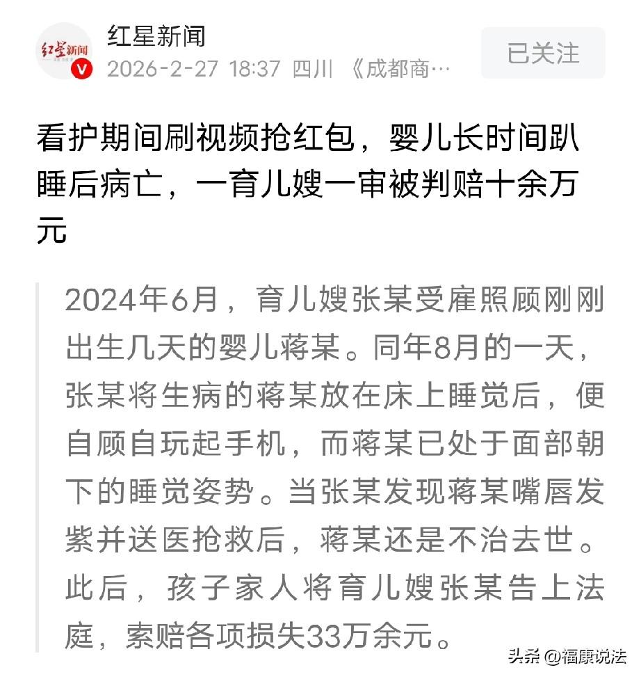 令人痛心!浙江金华,女子是育儿嫂,接手照顾一刚出生的婴儿,某晚,她让婴儿趴着睡觉,她背对着婴儿玩手机,约20-30分钟后,等她再看婴儿时,婴儿已经脸朝下,嘴唇发紫,送医后,一切都晚了,婴儿当晚离世。婴儿家属将女子告上法院索赔33万余元,女子却说:家属的证据,不能证明婴儿的死亡和自己有因果关系。法院一审判决:赔! 据红星新闻2月27号报道一则让家长揪心的案例,令人痛心。 2024年6月份,小婴儿蒋某刚刚出生,家里请了育儿嫂张某来照顾,殊不知,所托非人。 按理说,带这么小的宝宝,尤其是还生病的宝宝,眼睛都不能离开片刻,这是最基本的良心和职业底线。 可谁能想到,2024年8月14号晚上,张某把生病的宝宝趴着放在床上睡觉,一开始她还把孩子的脸侧了过去。 可仅仅一两分钟后,宝宝就脸朝下了,张某随手掰过来婴儿的脸让其侧向一边,翻个身就彻底不管了。 张某背对着宝宝,一头扎进了自己的手机世界:刷视频、抢红包、打游戏、聊天,玩得不亦乐乎,早就把身边那个脆弱的、正在生病的小婴儿忘在了脑后。 那时候她心里估计只想着多抢几个红包、多看几个搞笑视频,压根没琢磨过:这么小的孩子趴着睡会有多危险,而生病的孩子更需要时刻盯着。 她大概觉得,孩子睡了,自己就能摸鱼偷懒,反正一时半会儿也不会被发现。 张某就这样玩了20到30分钟,等她终于想起去看孩子一眼时,眼前的画面足以让任何人心碎:宝宝依旧脸朝下趴着,嘴唇已经发紫,连呼吸都快没了。 张某这才慌了神,赶紧把孩子送医,可一切都晚了,当晚,这个才两个多月的小生命,永远离开了人世。 孩子的父母该有多绝望啊!花了钱请专业育儿嫂,就是想让宝宝得到最好的照顾,结果换来的是天人永隔。他们一怒之下把张某告上法庭,索赔33万多。 而这位育儿嫂张某,到了法庭上还在辩解,说证据不能证明自己的行为和孩子死亡有关系,觉得自己没多大错。 据相关部门核查后认定,事发时,孩子本身确实有病,但张某的失职,让孩子长时间趴卧,胸腹部没法正常呼吸、口鼻也被堵住,直接加剧了呼吸衰竭,加速了孩子的死亡。 这事让人唏嘘,一个孩子的命,是一个家庭的全部,不管是育儿嫂、保姆,还是自己带娃的家长,只要孩子在身边,就不能分心走神,更不能抱着侥幸心理偷懒。 既然干了这份工作,上岗就要守规矩,尽职尽责,因为责任心比证书更重要。 也给家长提了醒,雇人看护不能全放手,日常监督、留痕、选正规渠道,都是对孩子妥善的保护。 本案中,家政看护属于有偿受托照料,张某作为育儿嫂拿了报酬,就必须尽到对应安全与照护义务。 《民法典》第1165条规定:行为人因过错侵害他人民事权益造成损害的,应当承担侵权责任。 张某因疏忽、玩手机、不按规范看护,导致孩子受伤害或死亡,就属于有过错,必须按过错比例赔偿。 虽然孩子死亡主要是自身疾病导致,但张某的疏忽是次要原因。 最终,法院判决:张某担10%的责任,扣除之前给的3万,还要再赔13万多。 这是一个悲剧,钱赔得再多,也换不回那个小生命,留给这个家庭的伤痛,一辈子都抹不掉。 而张某,一辈子都会背着“看娃玩手机害死婴儿”的良心债,十几万的赔偿,也会让她为自己的偷懒、不负责任,付出沉重的代价。 育儿嫂一个小小的疏忽,造成的是一辈子的遗憾。别等悲剧发生了才后悔,别让一时的贪玩,毁掉一个家庭,也毁掉自己的人生。