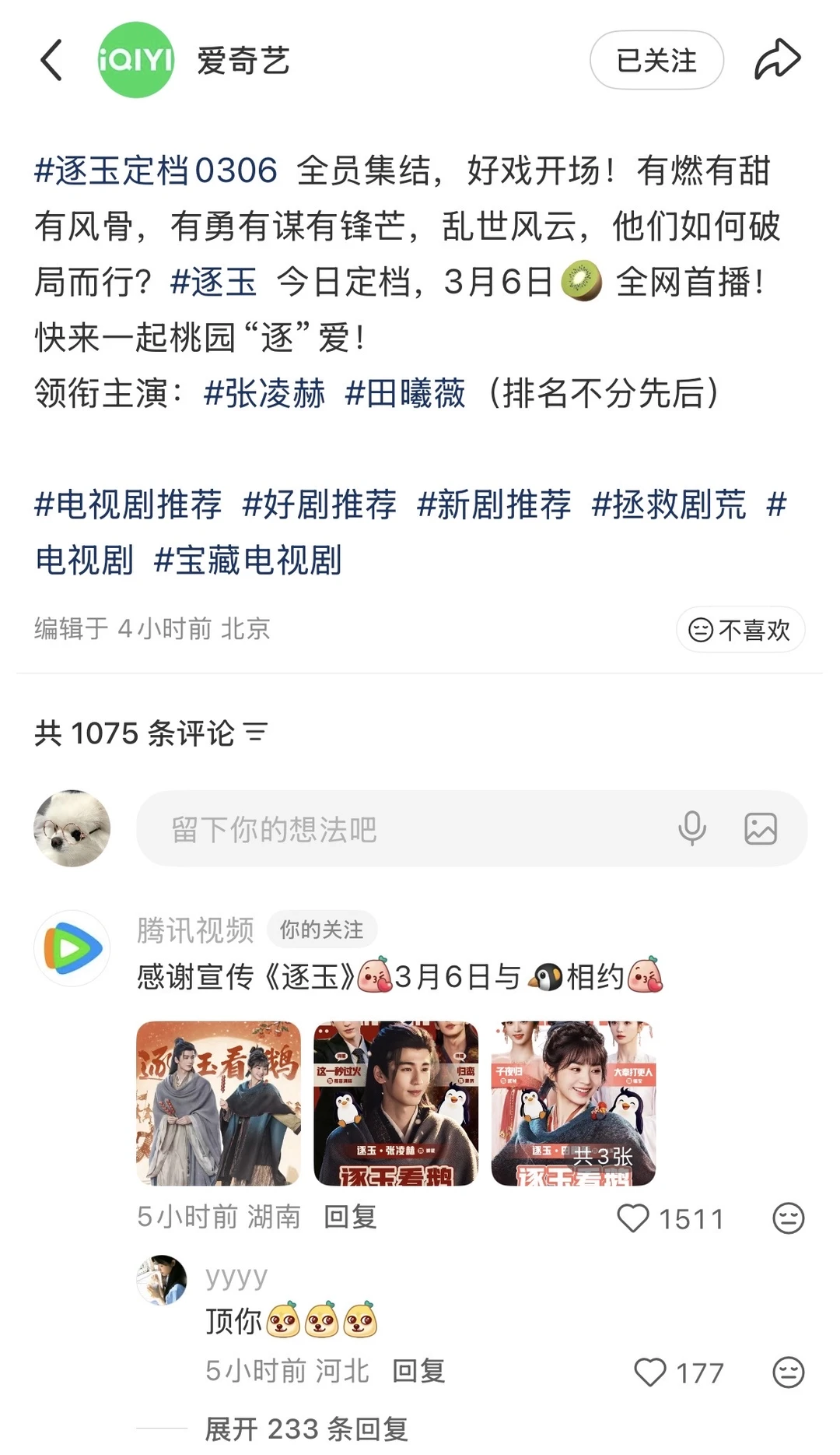 先是🐧直接跑到🥝评论区贴脸开大“感谢宣传《逐玉》”