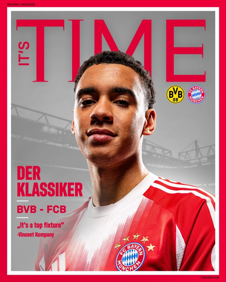 拜仁本次发布的海报设计独具匠心,采用了知名杂志《TIME》的封面风格。拜仁前锋穆西亚拉身着球队红白战袍占据封面,海报上方印有醒目的红色大字“IT'STIME”,下方则用德语标注"经典对决”,并配上了主帅孔帕尼的评价:“这是一场顶级较量”。