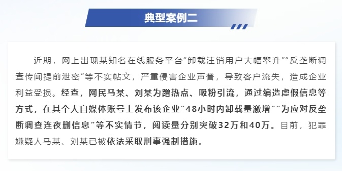 近期,网上出现某知名在线服务平台“卸载注销用户大幅攀升”“反垄断调查传闻提前泄密”等不实帖文,严重侵害企业声誉,导致客户流失,造成企业利益受损。经查,网民马某、刘某为蹭热点、吸粉引流,通过编造虚假信息等方式,在其个人自媒体账号上发布该企业“48小时内卸载量激增”“为应对反垄断调查连夜删信息”等不实情节,阅读量分别突破32万和40万。目前,犯罪嫌疑人马某、刘某已被依法采取刑事强制措施。