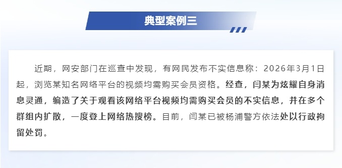 近期,网安部门在巡查中发现,有网民发布不实信息称:2026年3月1日起,浏览某知名网络平台的视频均需购买会员资格。经查,闫某为炫耀自身消息灵通,编造了关于观看该网络平台视频均需购买会员的不实信息,并在多个群组内扩散,一度登上网络热搜榜。目前,闫某已被杨浦警方依法处以行政拘留处罚。