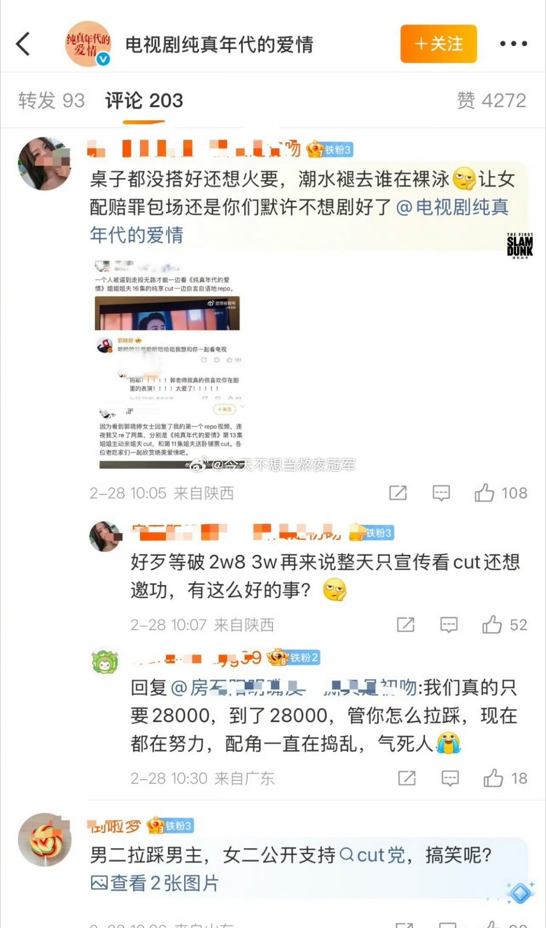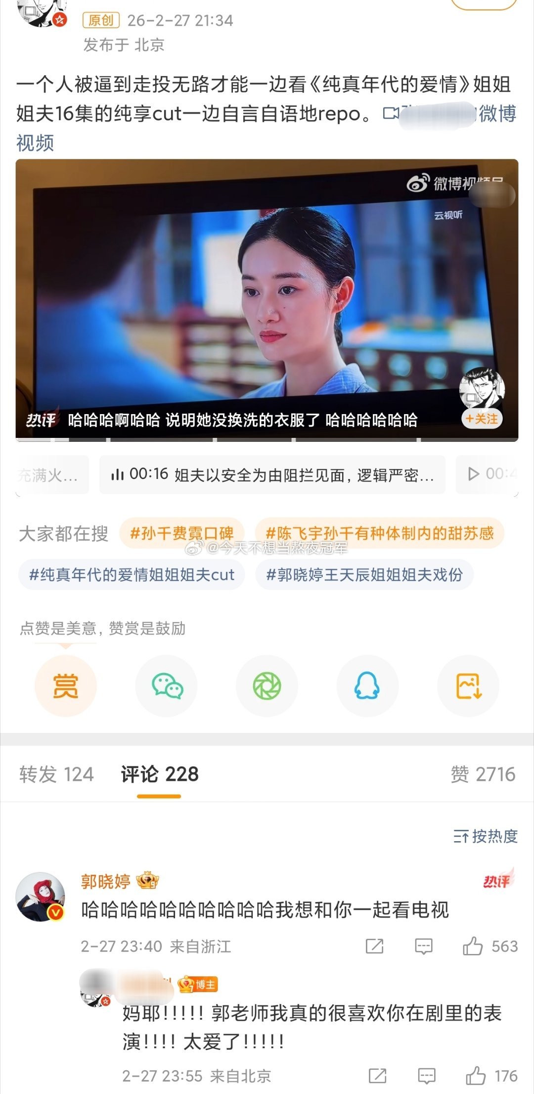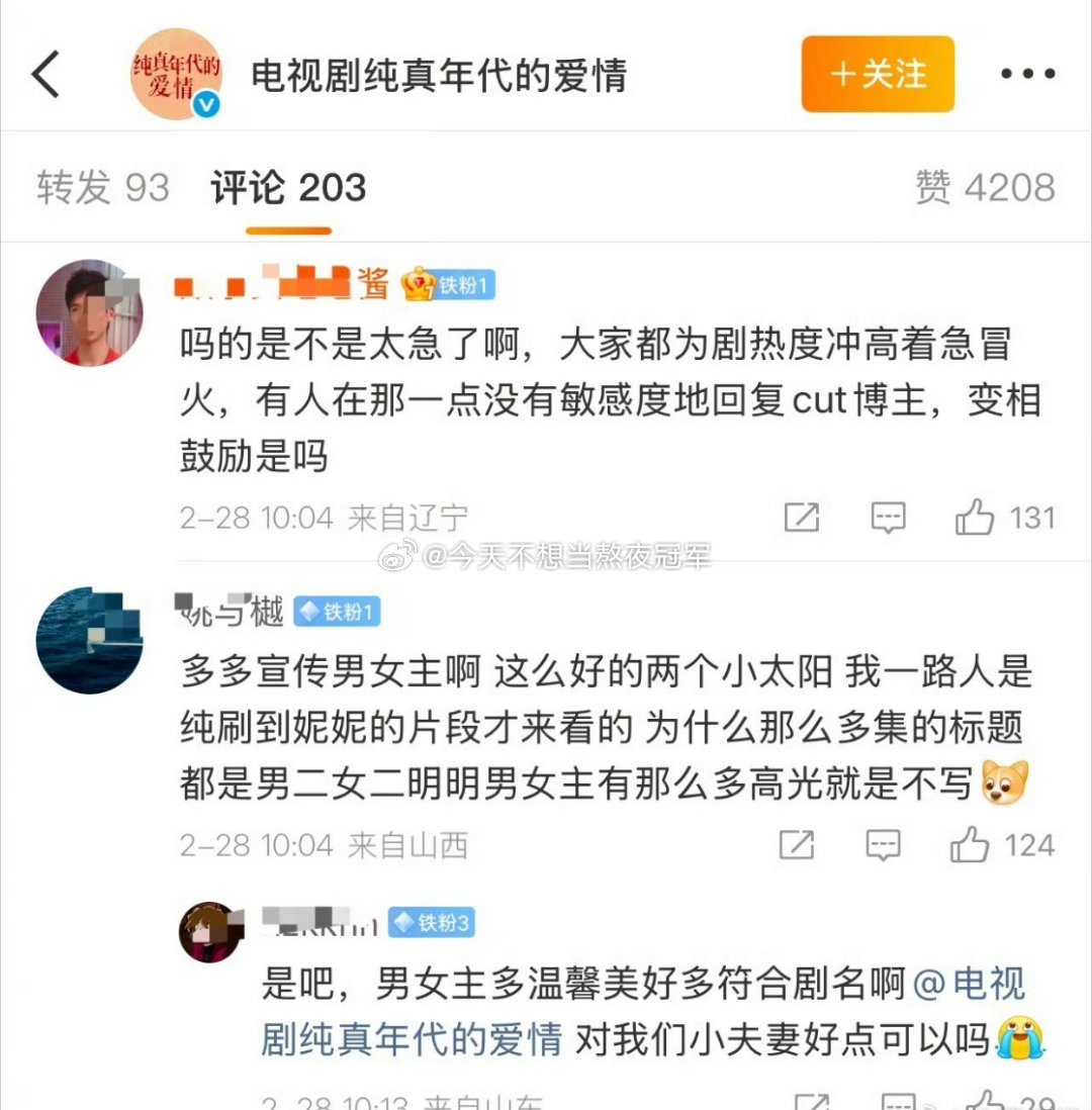 陈飞宇粉丝在《纯真年代的爱情》官博下面要说法,原因是女二回复了一个只看王天辰、郭