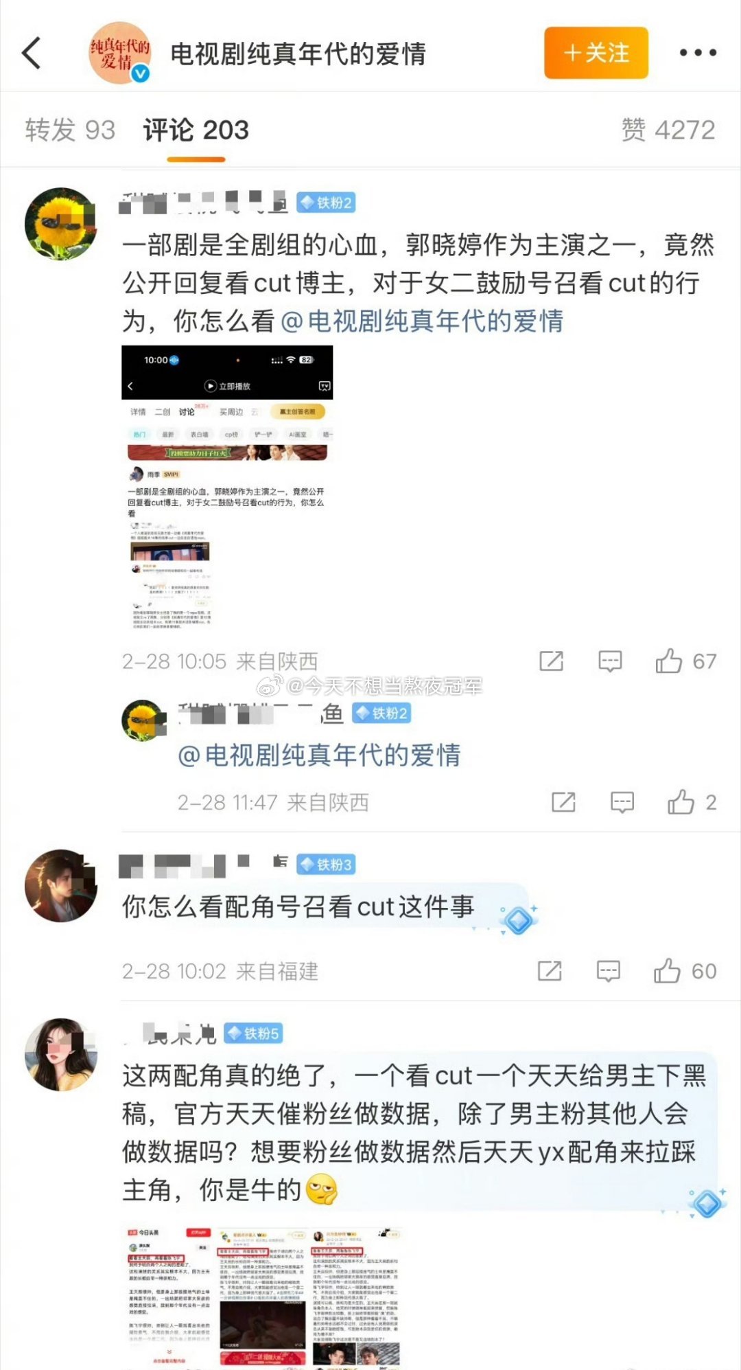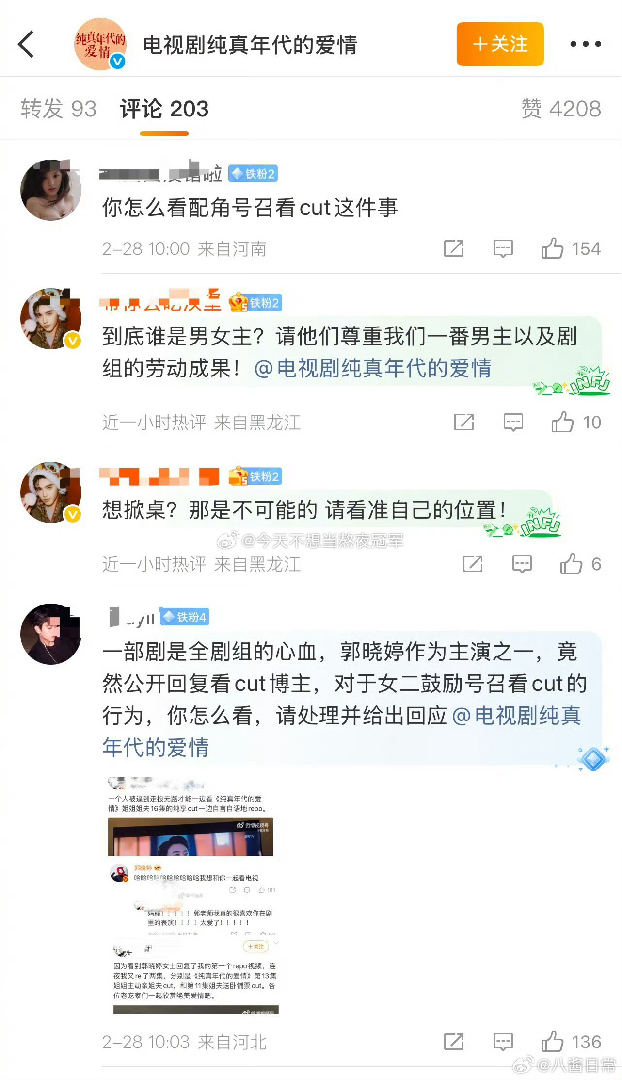 陈飞宇粉丝在《纯真年代的爱情》官博下面要说法,原因是女二回复了一个只看王天辰、郭晓婷cut的网友