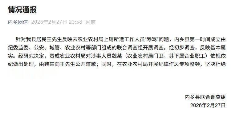 针对我县居民王先生反映去农业农村局上厕所遭工作人员“辱骂”问题,内乡县第一时间成立由纪委监委、公安、城管、农业农村等部门组成的联合调查组开展调查。经初步调查,反映基本属实。经研究决定,责成农业农村局对涉事人员魏某(农业农村局门卫,其下属企业职工)依规依纪做出处理,由魏某向王先生公开道歉;同时,在农业农村局开展纪律作风专项整顿,坚决杜绝类似问题再次发生。