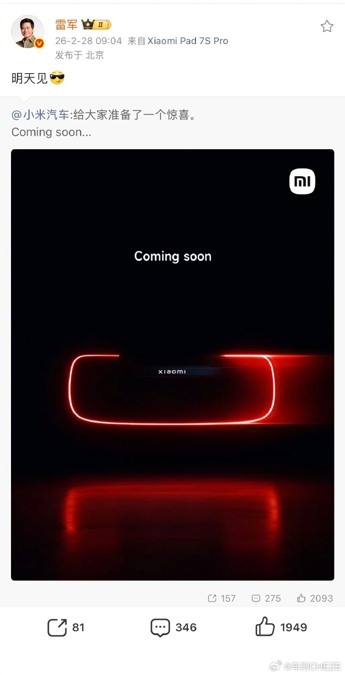 网传小米超跑实车图,作为参考,2月28日,小米汽车官方微博当天发文称,“给大家准备了一个惊喜”。小米创始人、董事长兼CEO雷军转发该条微博并配文“明天(2月29日)见”